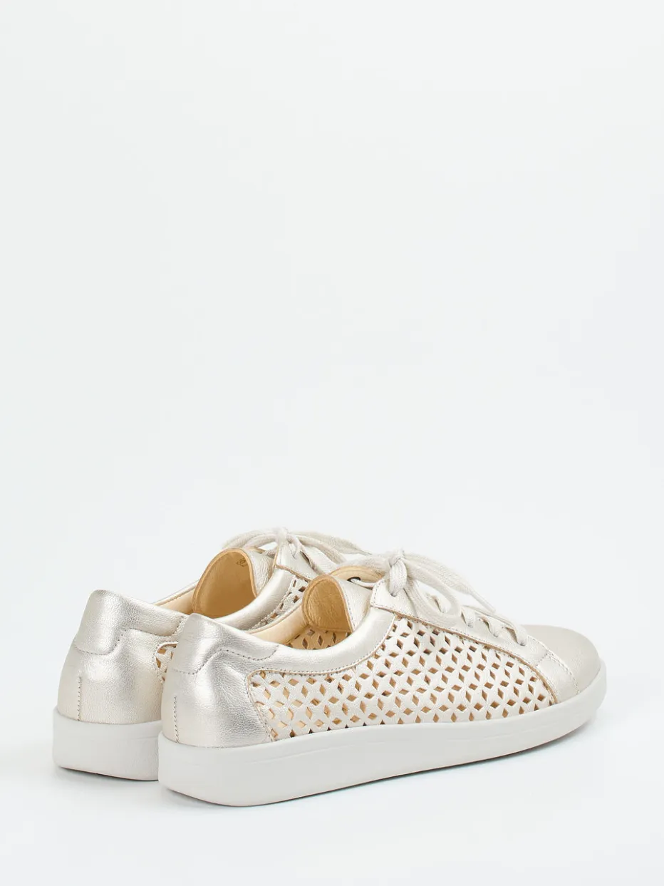 Glänzender Komfort für warme Tage.Christian Dietz bringt mit diesem beigen Sneaker ein besonders luftiges Modell für die warme Saison. Gefertigt aus schimmerndem Metallicleder mit perforierten Seitenteilen, vereint der Low-Top-Sneaker modischen Metallic-Look mit funktionalem Tragekomfort. Die flache Silhouette mit gepolstertem Schaftrand, die komfortable Weite H sowie das ledergefütterte, antibakterielle Fußbett sorgen für ein angenehmes Laufgefühl – auch barfuß. Eine flexible Gummisohle mit Luftpolstertechnik federt Schritte gelenkschonend ab. Die champagnerfarbene Optik mit tonigen Schnürsenkeln passt ideal zu neutralen Sommer-Looks. Ein moderner Bequemschuh – ideal für trendbewusste Freizeitmomente.