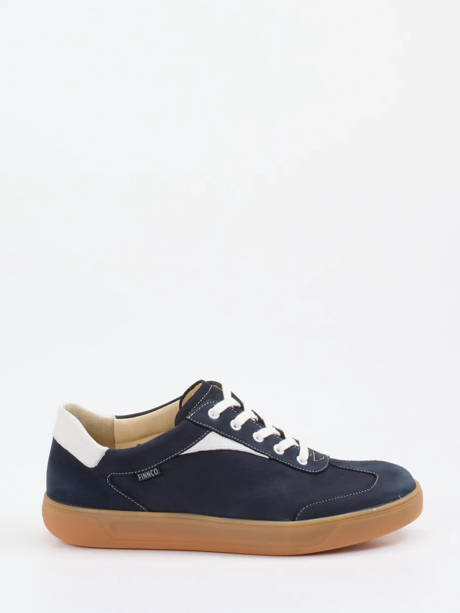 Sommerlicher Komfort mit Retro-Charme.Finn Comfort präsentiert einen komfortorientierten Herren-Sneaker für Alltag und Reise. Ob City-Spaziergang oder lässiger Urlaubslook – das navyblaue Nubukleder, samtig angeschliffen, trifft auf glatte weiße Akzente an Schnürung und Kontrastnähten. Die klassische, flache Silhouette mit gepolstertem Fersenbereich wird durch eine karamellfarbene Gummisohle ergänzt, deren ShockAbsorber-Technologie jeden Schritt dämpft. Das herausnehmbare Korkfußbett unterstützt eine fußgerechte Haltung. Minimalistisches Design im Geist der Quiet-Comfort-Ästhetik trifft auf Retro-inspirierte Formgebung. Finn Comfort steht für nachhaltige Bequemlichkeit mit anatomischem Anspruch.