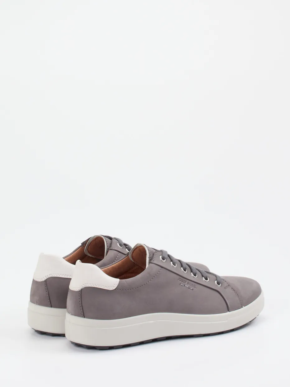 Reduziert im Design, stark im Komfort.Josef Seibel präsentiert einen schnörkellos gestalteten Low-Top-Sneaker für stilvolle Casual-Outfits. Ob beim Stadtbummel oder entspannten Treffen mit Freunden: Der in Steingrau gehaltene Sneaker kombiniert geschmeidiges Nubukleder mit matter Oberfläche und einem komfortabel gepolsterten Fersenbereich. Die weiße Kontrastpartie an der Ferse betont die klassische Rundsilhouette dezent, silberne Metallösen und symmetrische Schnürung runden das durchdachte Design ab. Eine profilierte Gummisohle sorgt für sicheren Grip und rundet den alltagstauglichen Stil funktional ab. Ideal zu Chinohose oder leichter Übergangsjacke. Unaufdringlicher Look trifft auf überzeugende Markenqualität.