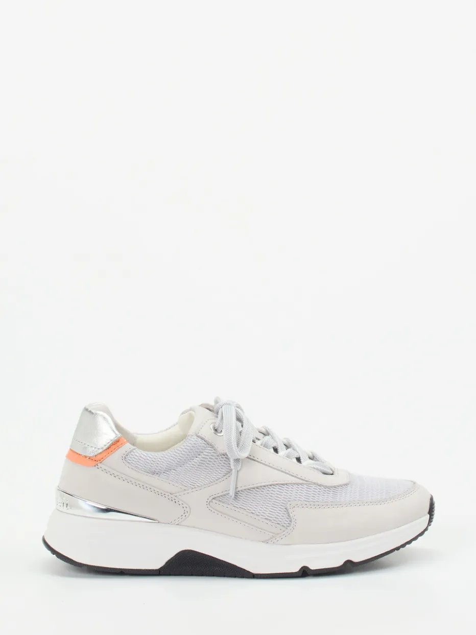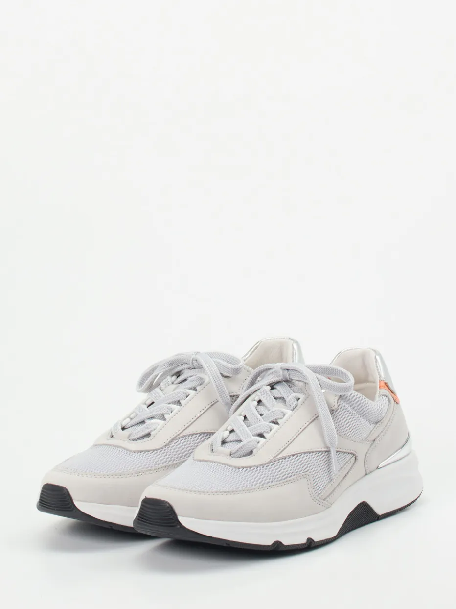 Details für stilbewusste Dynamik.Gabor Comfort zeigt mit diesem Komfort-Sneaker seine Expertise für tragbare Ästhetik. Ob unterwegs in der City oder bei aktiven Tagestouren – dieser Damen-Sneaker aus taupefarbenem Nubukleder mit samtiger Oberfläche kombiniert ein leichtes Mesh-Gewebe mit funktionaler Gummisohle. Die sportlich-voluminöse Silhouette erhält durch die silberfarbene Fersenkappe und orange Akzentstreifen ein modernes Update. Dank gepolsterter Ferse und rollingsoft-Laufsohle wird der Fuß optimal geführt. Der Look ist inspiriert von Streetwear und aktuellen Trendlinien wie Metallic Accents. Komfort trifft bei Gabor Comfort auf urbanes Designverständnis.