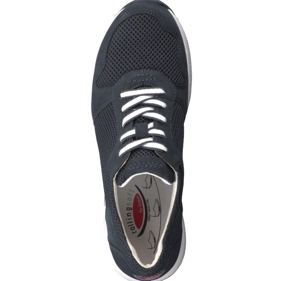 Bewegung mit Komfortgedanken.Gabor Comfort präsentiert einen Damen-Sneaker der Serie Rollingsoft mit Fokus auf Alltag und Leichtigkeit. Der klassisch niedrig geschnittene Sneaker überzeugt durch sein nachtblaues Nubukleder, das samtig angeschliffen ist, ergänzt durch atmungsaktive Mesh-Einsätze. Weiße Kontrastnähte, Schnürsenkel und der dezente Logo-Print an der Ferse setzen frische Akzente. Die gepolsterte Komfortsohle mit Rollsohlen-Technologie fördert ein natürliches Abrollen des Fußes. Der Schnürverschluss sowie der weich gepolsterte Schaftrand unterstreichen den funktionalen Anspruch. Ein zeitgemäßer Look zwischen Streetwear und easy Chic. Ausgewogen zwischen Stil und Ergonomie – für eine gehobene Alltagsbeweglichkeit im typischen Gabor-Komfort.