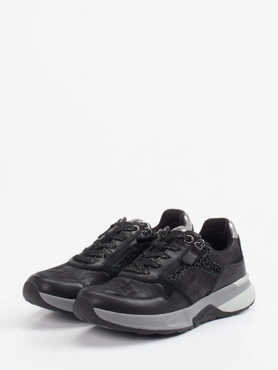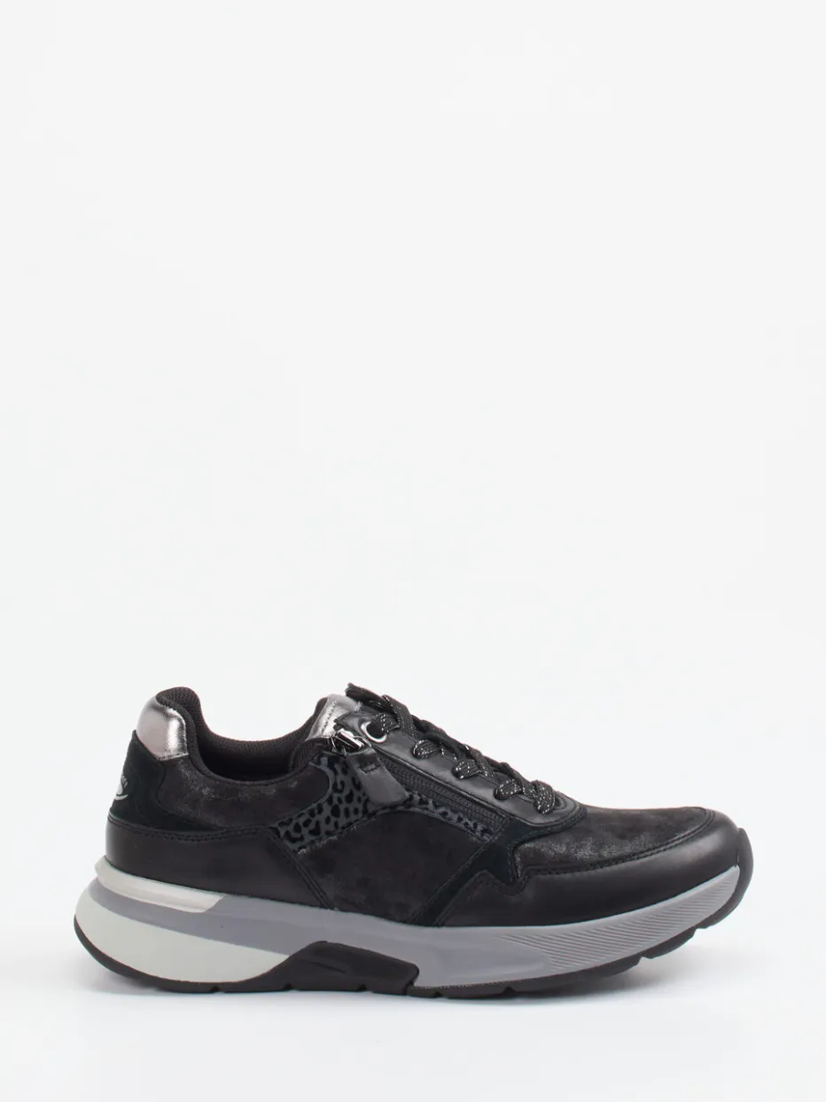 Komfort trifft auf modischen Akzent.Gabor Comfort präsentiert einen Damen-Sneaker, der Bequemlichkeit und Designanspruch stilvoll vereint. Ideal für ausgedehnte Citytouren oder entspannte Freizeittage überzeugt das Modell durch sein Stretch-Obermaterial, ergänzt um samtig wirkende Veloursleder-Einsätze. Die Farbgebung in Anthrazitgrau mit schwarzen und silbergrauen Akzenten wird durch ein dezentes Animal-Muster sowie ein schimmerndes Metallic-Fersenelement lebhaft akzentuiert. Reißverschluss und Schnürung sorgen für mühelosen Einstieg, während die gepolsterte Gummisohle mit Rollingsoft-Technologie dämpfenden Tragekomfort bietet. Die voluminöse Form verleiht dem Schuh einen trendstarken Chunky-Look mit Streetwear-Appeal. Gabor Comfort vereint ergonomische Raffinesse mit urbaner Modekompetenz.