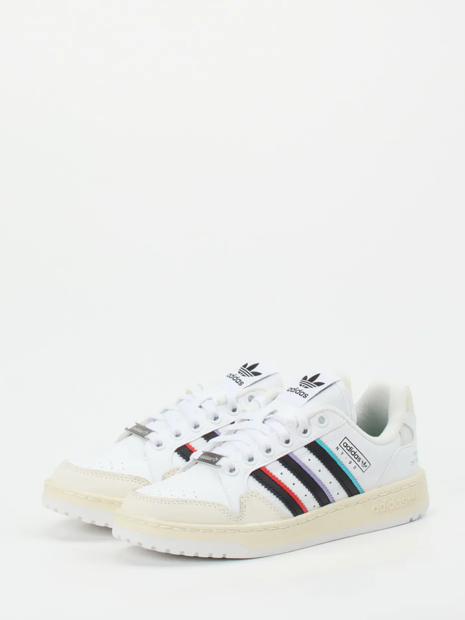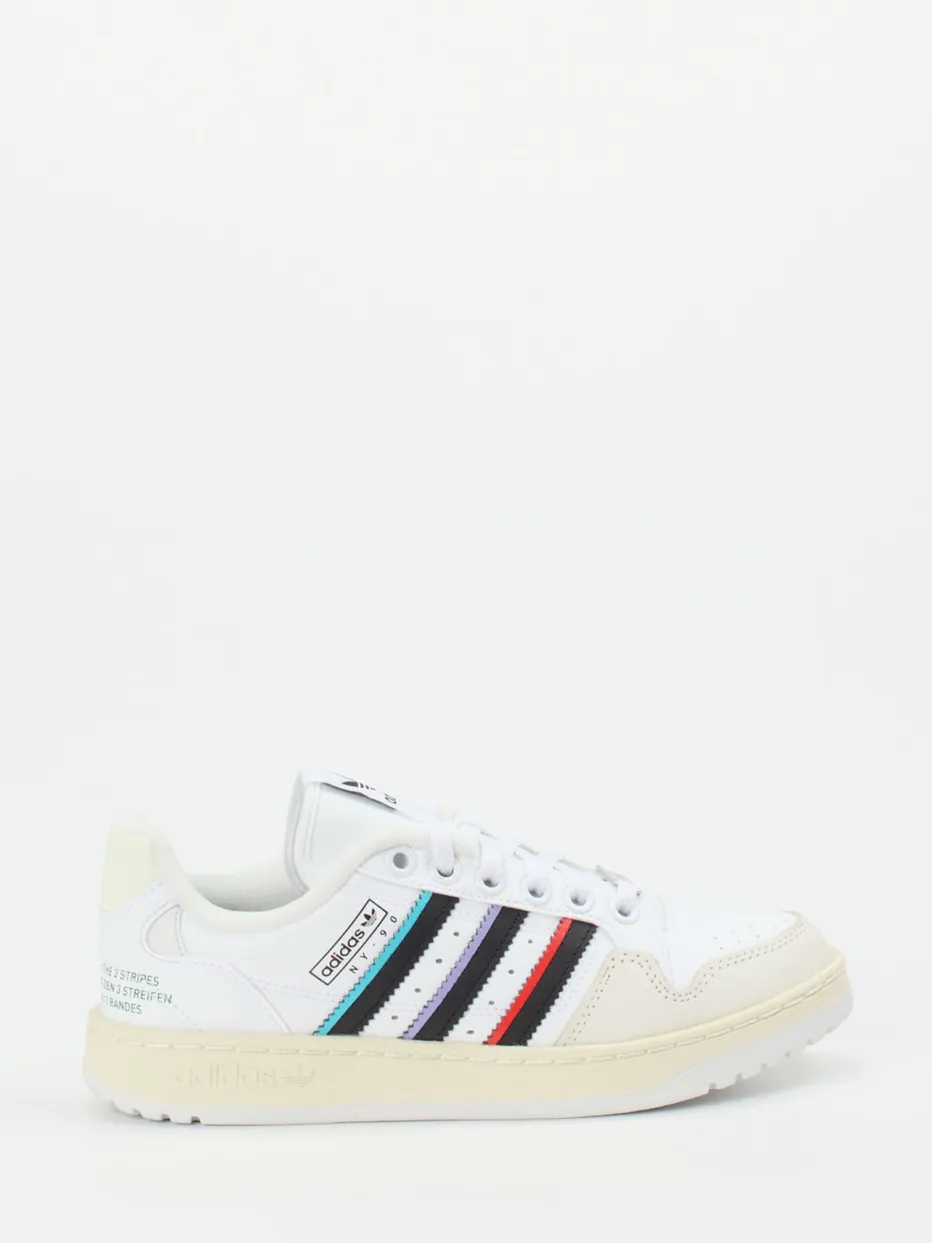 Ein Statement für Streetwear-Fans.Adidas präsentiert mit diesem Sneaker aus der NY 90 Stripes-Serie ein sportiv-urbanes Modell im Low-Top-Format. Klassische Freizeit-Outfits erhalten mit diesem Sneaker ein modernes Update. Gefertigt aus funktionalem Synthetik mit glatter Oberfläche, überzeugt er durch klare Farbtöne in Weiß und Creme sowie markante Streifendetails in Türkis, Schwarz, Lila und Rot. Die flache Silhouette mit perforierter Zehenpartie und verstärkter Ferse betont den Retro-Basketball-inspirierten Charakter. Eine griffige Gummisohle und gepolstertes Textilfutter versprechen hohen Tragekomfort – perfekt für Alltag und Ausgehen. Gut kombinierbar mit Baggy Jeans und Oversized-Hoodie. Ein authentischer Sneaker mit Streetstyle-Appeal aus dem Hause Adidas.