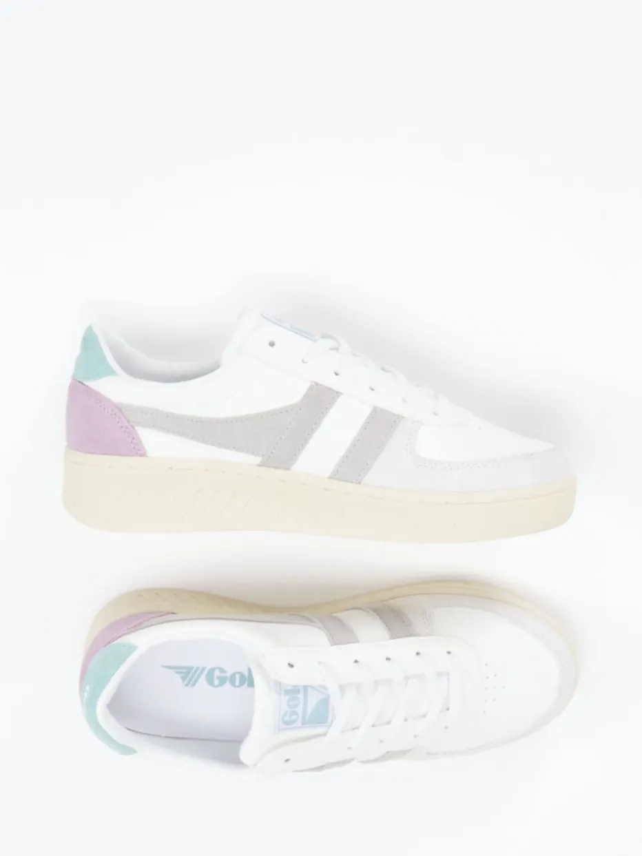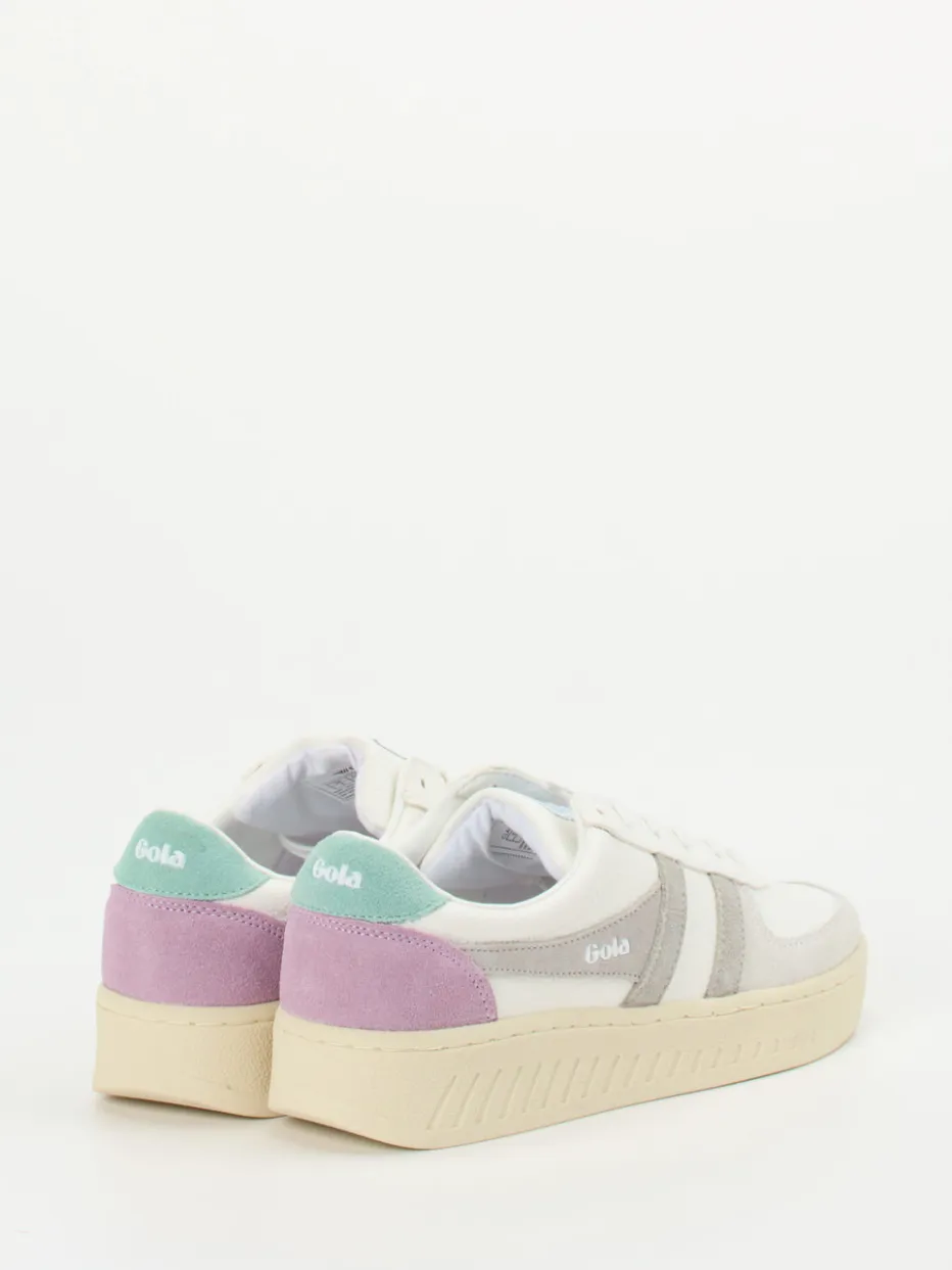 Pastell trifft Retro-Flair.Gola präsentiert mit diesem Sneaker ein modisches Unisex-Modell für entspannte Alltagssituationen. Das Obermaterial aus strukturiertem Synthetik wird durch samtig angeschliffenes Veloursleder ergänzt. Pastellfarbene Akzente in Flieder und Mint an der Ferse setzen visuelle Highlights auf dem offwhitefarbenen Grund. Die klassische, flache Retro-Silhouette mit Schnürung, gepolstertem Schaftrand und geprägtem Sohlenlogo vereint Ästhetik und Komfort. Trendstark dank „Pastel Accents“ und „Court Sneaker Revival“, eignet sich der Schuh ideal für Freizeitlooks mit leichtem Frühlings-Charakter. Ein leichter, stilbewusster Allrounder mit typischer Gola-Signatur.