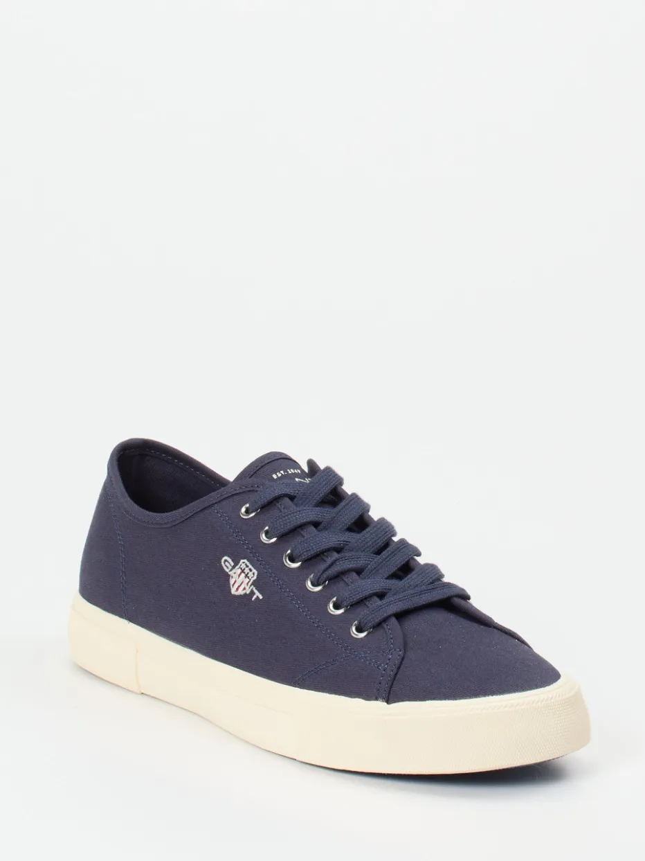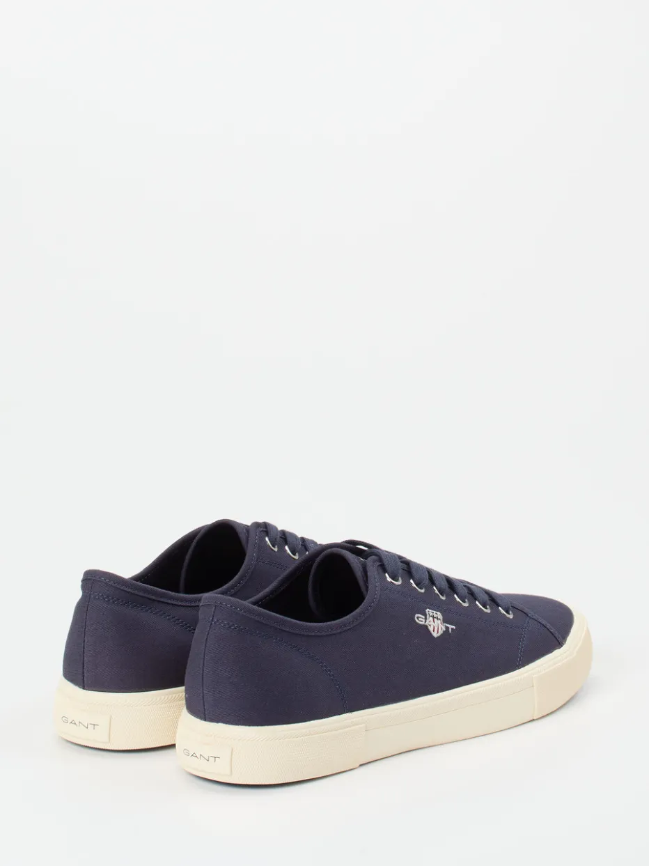Gant präsentiert einen Low-Top-Sneaker für die Freizeit. Das Modell überzeugt mit einem dunkelblauen Obermaterial aus veganem Textil mit matter Canvas-Haptik und silberfarbenen Metallösen.