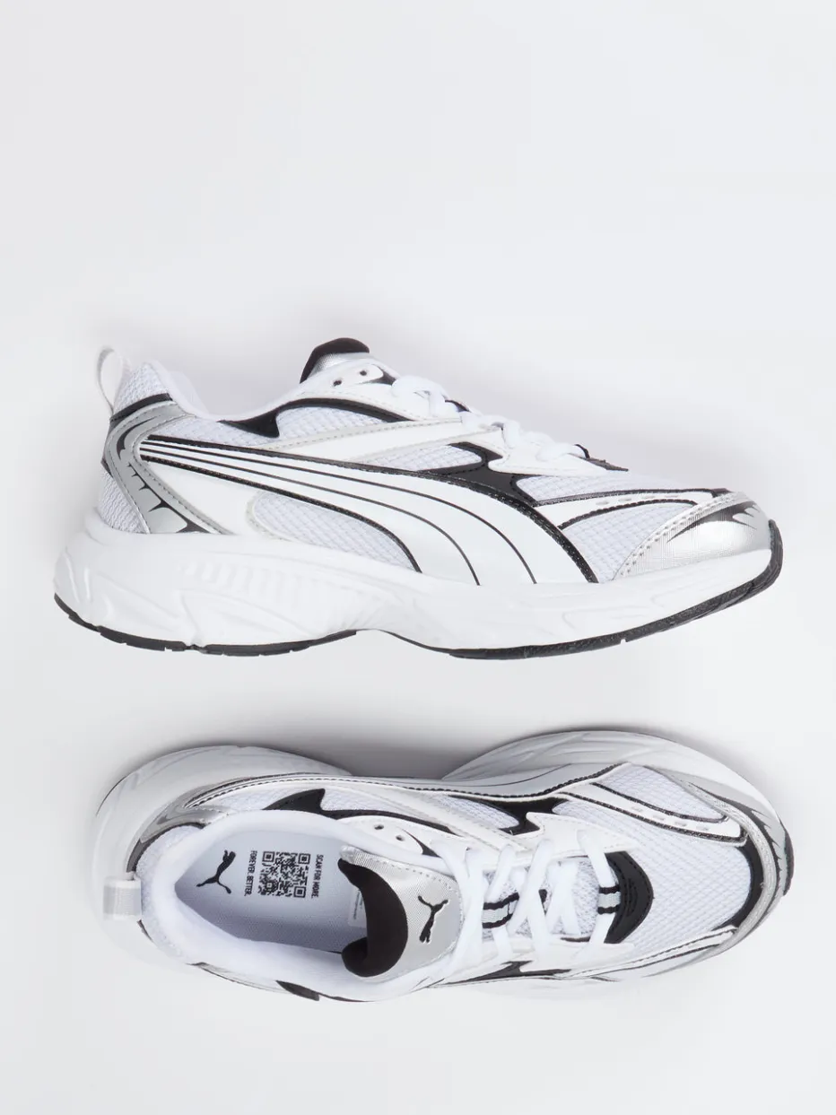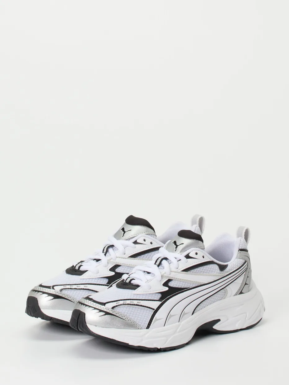 Zwischen Retro-Chic und Alltagstauglichkeit.Puma liefert mit diesem Sneaker einen stilvollen Beitrag zur Kategorie Retro-Running-Schuhe im Y2K-Design. Ob für entspannte City-Trips oder sportliche Freizeitlooks – dieser Sneaker überzeugt mit atmungsaktivem Textilmaterial, ergänzt um Mesh-strukturierte und glatte Synthetikflächen. Die dominante Weiß-Silber-Kombination wird durch schwarze Kontrastlinien akzentuiert und von einer voluminös-dynamischen Form ergänzt. Silberne Overlays, eine gepolsterte Zunge und die effiziente Schnürung unterstreichen Funktion wie Ästhetik. Griffige Gummisohle und Streetwear-Appeal machen ihn zum vielseitigen Begleiter. Ein trendbewusstes Highlight mit sportlich-futuristischer Note – markentypisch urban.