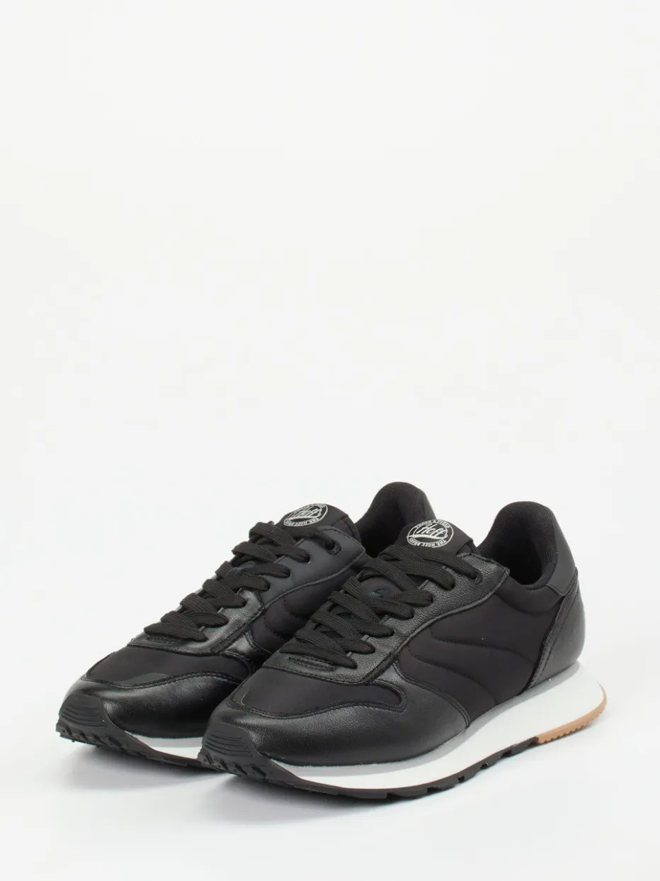 Retro trifft auf Minimalismus.THE HOFF BRAND präsentiert einen sportlich-flachen Sneaker für Alltag und Freizeit. Das Modell verknüpft mattschwarzes Textil mit glattem Leder für markanten Materialkontrast. Ideal für urbane Looks: Die unifarbene Silhouette mit gepolstertem Schaftrand und kontrastierender Profilsohle sorgt für Komfort und sicheren Stand. Logo-Applikationen auf Ferse und Zunge betonen den markentypischen Retro-Charakter, während eine klare Linienführung den minimalistischen Stil unterstreicht. Das Modell passt hervorragend zum „Retro Runner Revival“ sowie zu monochromen Outfits. Der perfekte Sneaker für souveräne Streetwear mit subtilem Markenfokus.