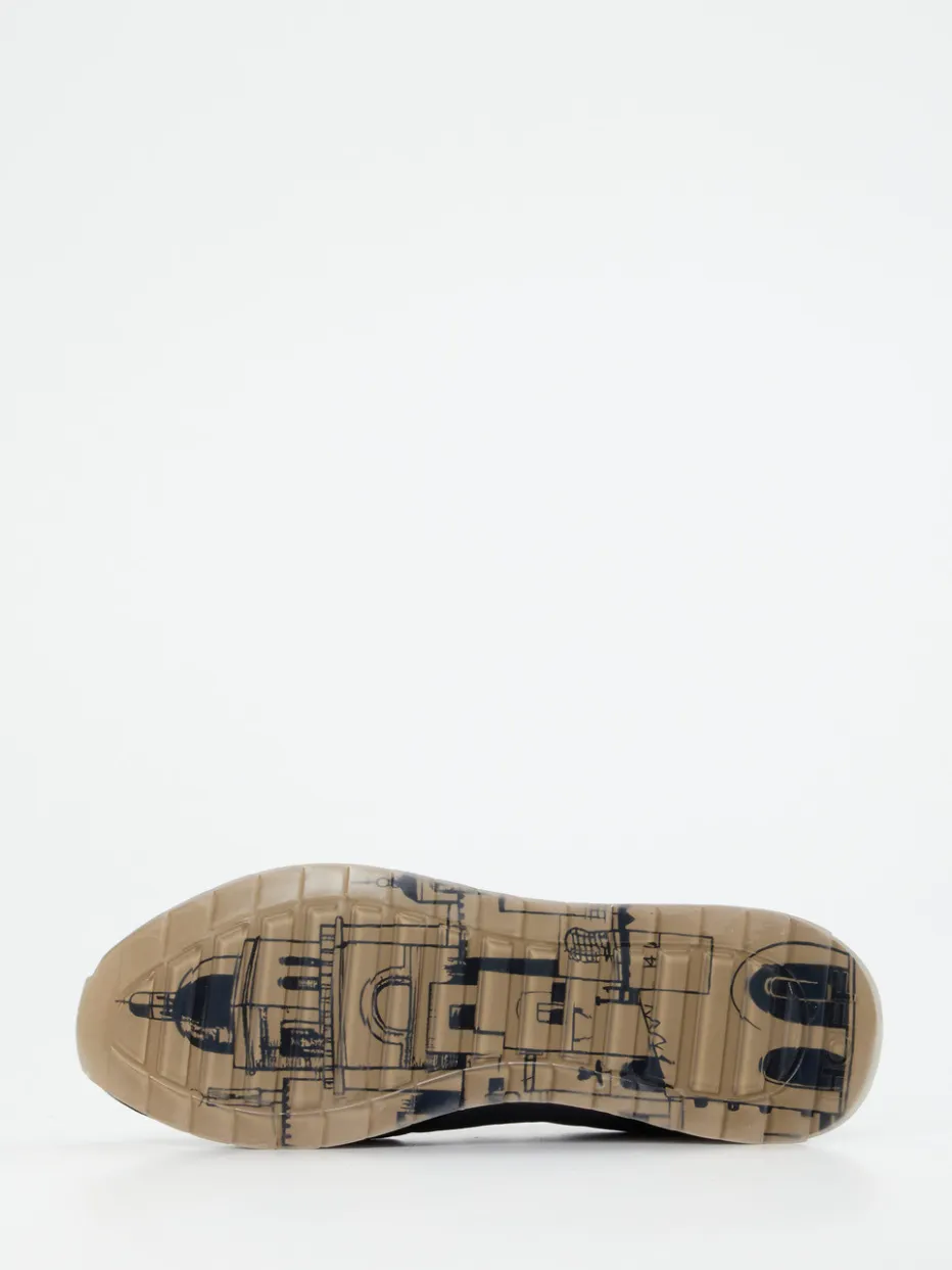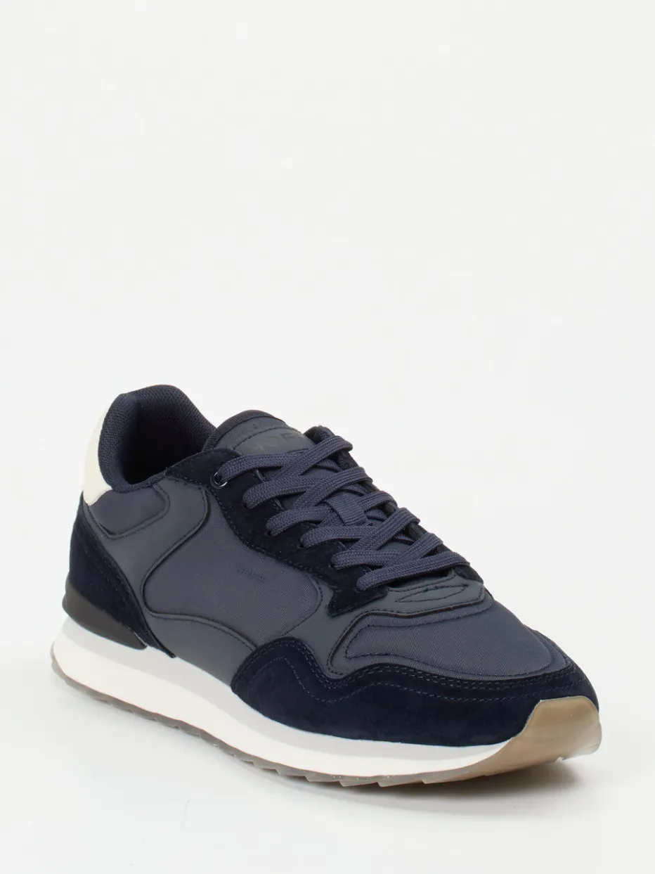 Statement-Stil im Retro-Update.THE HOFF BRAND präsentiert einen modischen Sneaker für Freizeit und Alltag. Sein klassisch-flacher Schnitt und der dunkelblaue Farbton machen ihn zum perfekten Begleiter für lässige City-Momente. Die Kombination aus atmungsaktivem Textil und Veloursleder mit matter Oberfläche überzeugt durch hochwertigen Komfort und stilvolle Haptik. Mehrteilige Overlays, ein gepolsterter Schaftrand sowie ein Logo-Print auf Ferse und Zunge unterstreichen den Vintage-Charakter. Highlight ist die transparente Gummisohle mit grafischem City-Print. Als Retro Runner greift dieses Modell aktuelle Streetwear-Trends auf und passt ideal zu Cropped Pants oder kontrastfarbenen Sportsocken. Ein charakterstarker Sneaker mit urbanem Anspruch von THE HOFF BRAND.