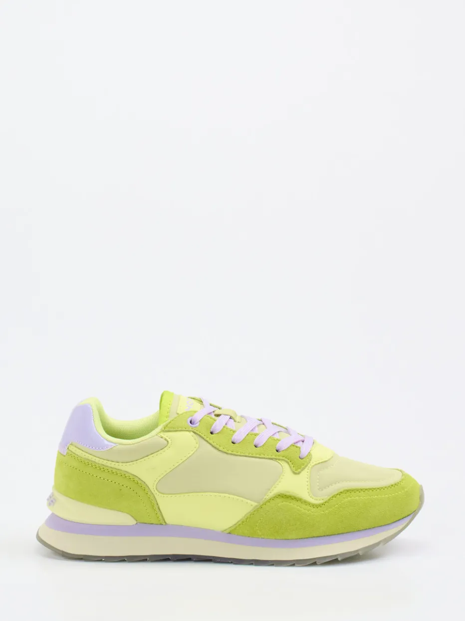 Für urbane Looks mit Retro-Flair.THE HOFF BRAND präsentiert mit diesem Sneaker aus der Städte-Edition ein modisches Statement im Streetwear-Style. Ein idealer Begleiter für Citywalks und locker gestylte Alltagsmomente: Der Retro Runner kombiniert weiches Textil mit samtigem Veloursleder und kontrastierendem Kunstleder. Die Farbgebung in Hellgrün, Flieder und Beige sowie die niedrig geschnittene Silhouette wirken trendbewusst und verspielt. Logo-Details an Ferse und Zunge unterstreichen den Markencharakter. Besonderes Highlight: die profilierte Gummisohle mit transparentem Einsatz und City-Hommage an Kathmandu. Der gepolsterte Schaft und das herausnehmbare Fußbett sorgen für Tragekomfort. Eine stylische Wahl im Zeichen des Y2K-Revival mit authentischem Markencharme.