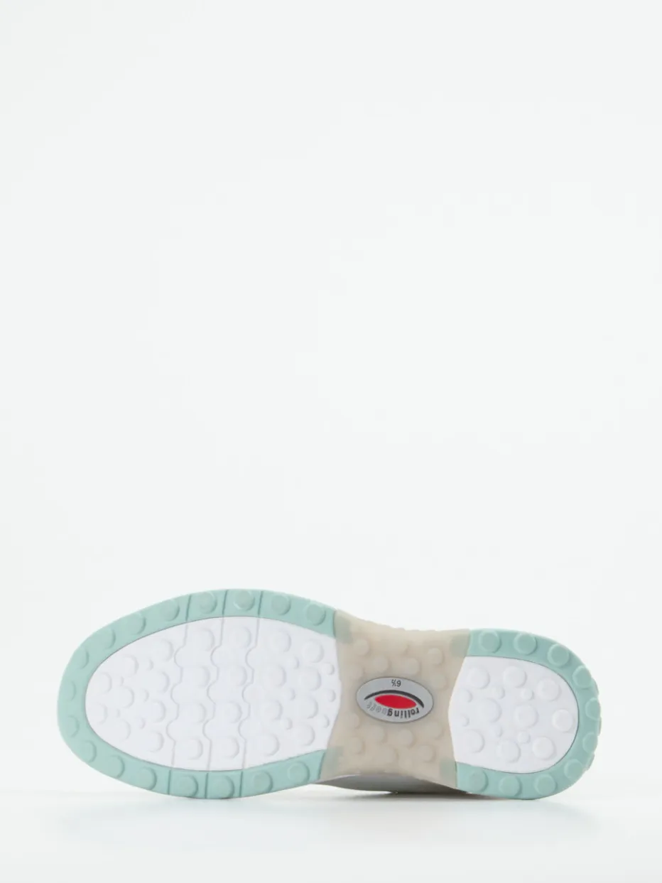 Sportlicher Komfort in frischem Pastell.Die Marke Gabor Comfort präsentiert mit diesem veganen Damen-Sneaker ein Modell aus ihrer Rollingsoft-Kollektion. Für aktive Tage im urbanen Umfeld vereint der Schuh luftiges Mesh mit synthetischen Overlays in einem sportlich-dynamischen Look. Die weiße Grundfarbe wird durch tonale Elemente und eine mintgrüne Fersenkappe akzentuiert. Eine profilierte, gedämpfte Gummisohle schenkt Trittsicherheit, das gepolsterte Fußbett lässt sich durch eigene Einlagen ersetzen. Stilistisch bewegt sich der Sneaker zwischen Athleisure und Soft Pastels. Ideal kombinierbar mit Leggings oder Jeans für lässige Freizeitstyle. Leichtes Laufgefühl mit funktionalem Komfort – Gabor Comfort typisch durchdacht.