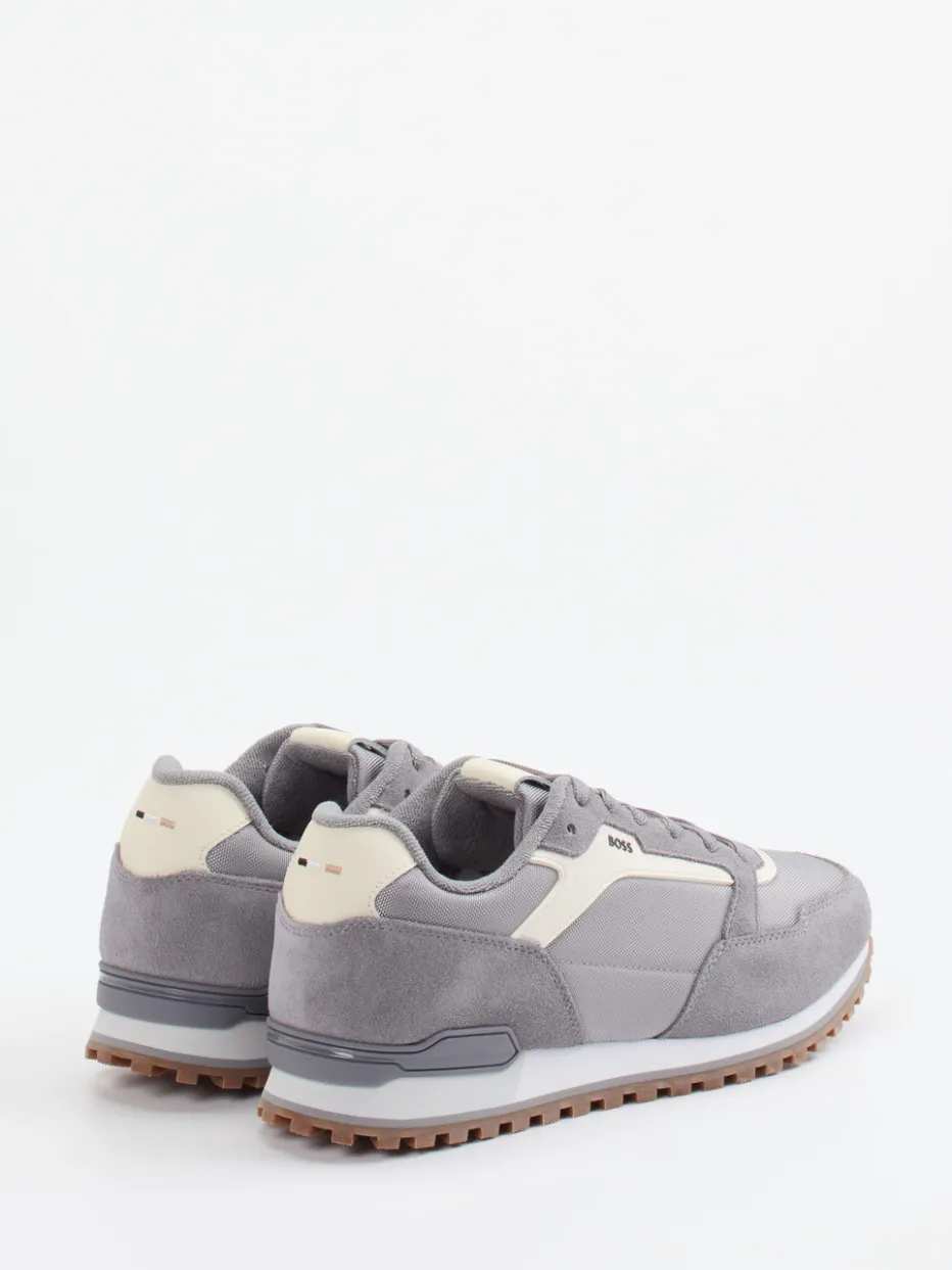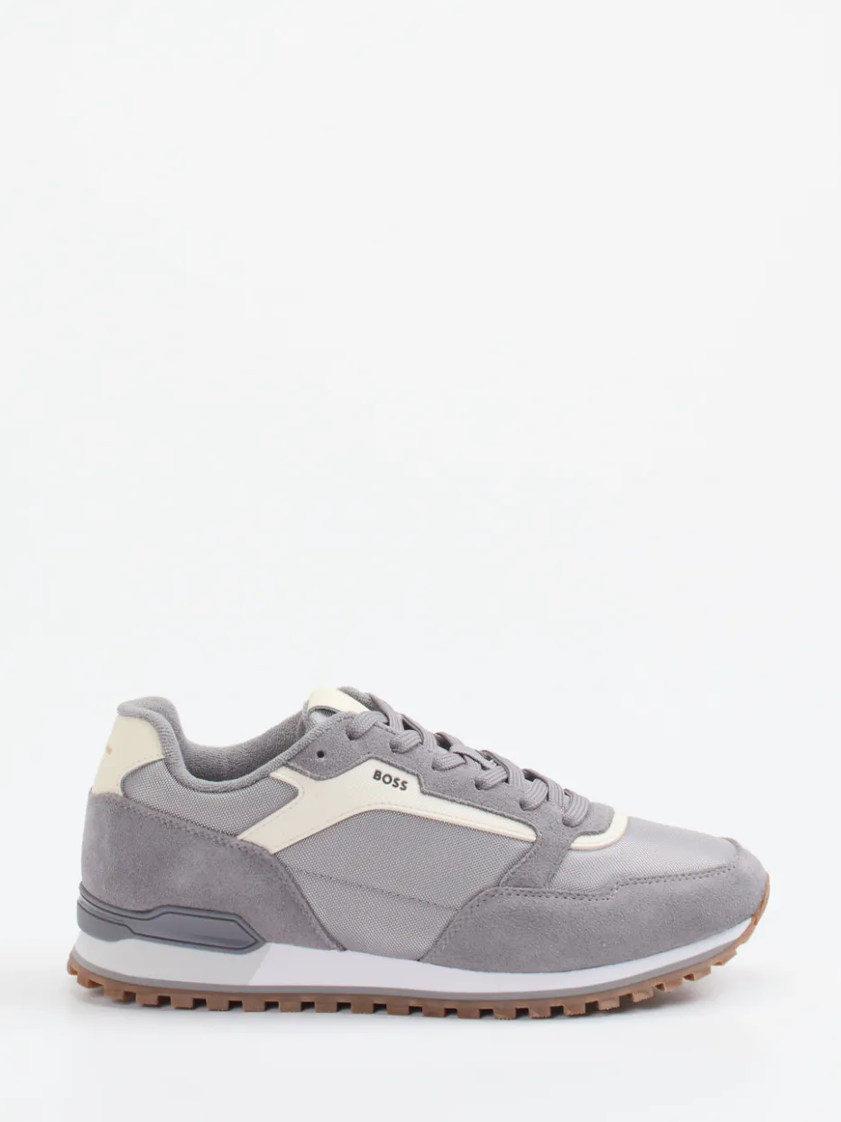 Retro-Akzent für urbane Styles.Mit dem Herren-Sneaker von Boss trifft sportiver Streetwear-Charme auf eine stilvolle Retro-Ästhetik. Ideal für entspannte Freizeitmomente bietet der Retro Runner durch das Zusammenspiel aus Velour/Textil einen angenehmen Mix aus weicher Haptik und robuster Funktion. Mittelgraues Obermaterial mit cremefarbenen und hellbraunen Akzenten unterstreicht die klassische Running-Silhouette. Details wie eine ergonomische Schnürung, gepolsterter Schaftrand und griffige Gummiprofilsohle ergänzen den Look funktional. Der dezente Logo-Schriftzug fügt sich harmonisch ein. Kombiniert mit Jogpants oder Bomberjacke entsteht ein trendiges Soft-Colorblocking-Ensemble. Komfortorientiertes Design mit authentischem Boss-Finish für stilbewusste Casual-Looks.
