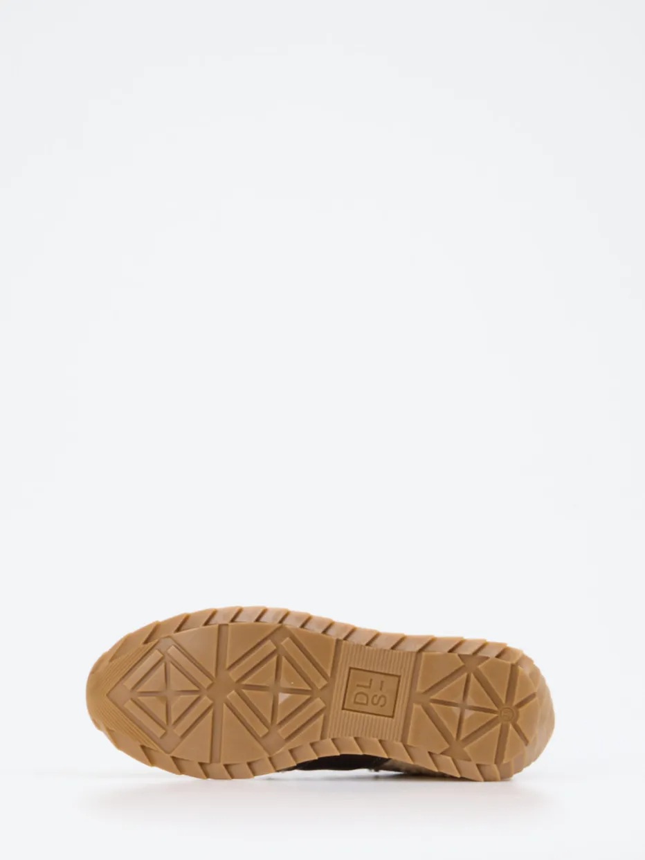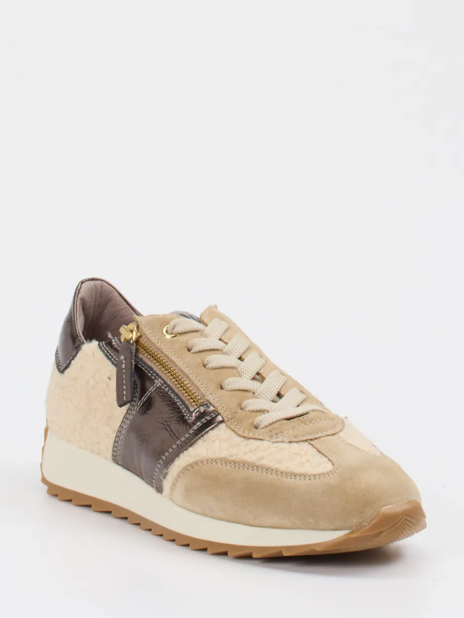 Materialmix mit Retro-Charme.DL Sport interpretiert den klassischen Damen-Sneaker mit Retro-Runner-Einflüssen neu. Ideal für lässige Freizeit-Looks: Das Modell kombiniert weiches Veloursleder mit flauschigen Textilpartien in Teddyfutter-Optik und glänzenden Metallic-Akzenten in Bronze. In harmonischem Beige gehalten, überrascht der Schuh mit strukturierten Kontrastmaterialien und goldfarbenem Reißverschluss neben der Schnürung. Die flache, profilierte Gummisohle unterstützt dabei sicheren Tritt und Alltagstauglichkeit. Dank komfortablem Innenfutter aus Leder und der Eignung für Einlagen bietet der Sneaker hohe Bequemlichkeit. Typisch DL Sport: stilbewusste Funktionalität mit modischem Finetuning.
