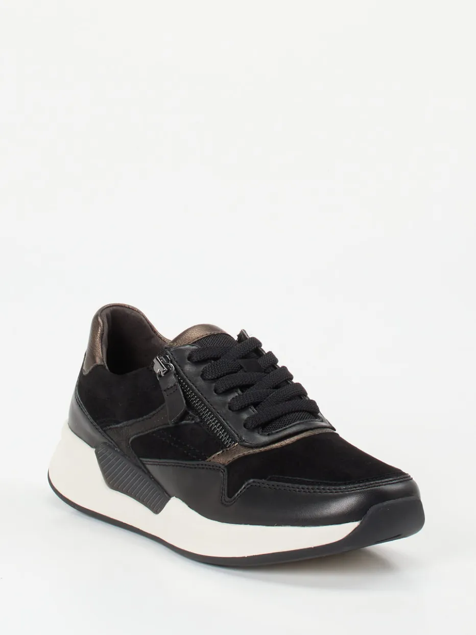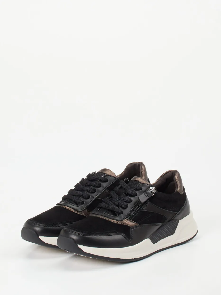 Sportliche Eleganz mit Metallic-Finish.Dieser Sneaker von Gabor Comfort aus der Rollingsoft-Linie vereint athleisure-inspiriertes Design mit funktionaler Raffinesse. Ob beim Stadtbummel oder im entspannten Alltag – das Zusammenspiel von butterweichem Veloursleder und tonigem Glattleder verleiht dem schwarzen Modell eine edel-matte Textur, die durch bronzefarbene Metallic-Overlays modisch kontrastiert wird. Das voluminöse Design passt perfekt in den Streetwear-Trend. Dank seitlichem Reißverschluss und gepolstertem Schaftrand punktet der Sneaker mit hohem Komfort. Die dämpfende Gummisohle mit integriertem Stabilisator unterstützt das natürliche Abrollen. Rollingsoft-Technologie für kontrollierte Bewegungen und stilbewussten Komfort.