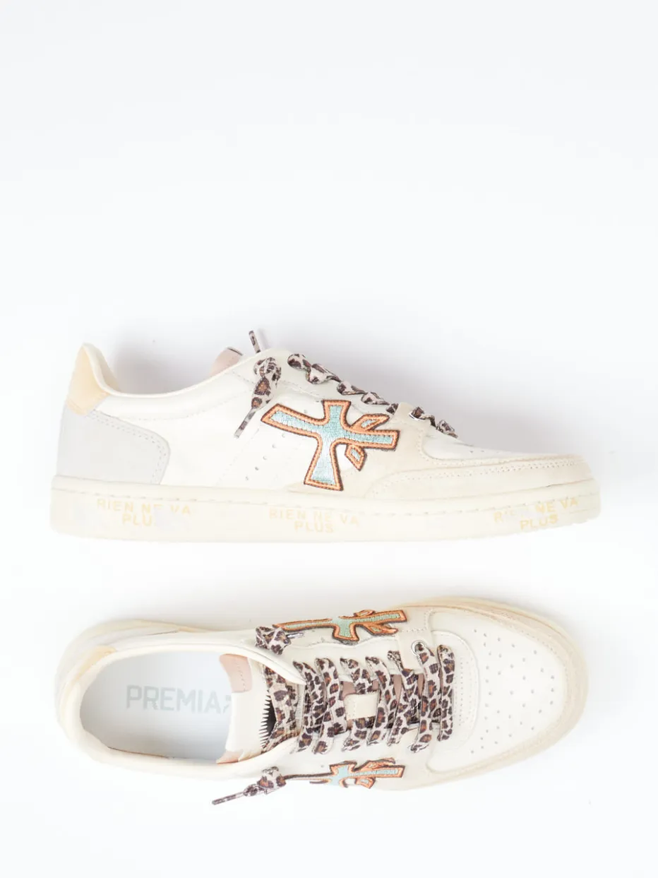 Design trifft Retro-Charme mit Stil.Premiata präsentiert mit diesem Low-Top-Sneaker eine moderne Interpretation sportlicher Klassiker. Ideal für urbane Looks in Freizeit und Alltag überzeugt das Modell Clayd durch eine hochwertige Kombination aus cremefarbenem Glattleder und samtig angeschliffenem Veloursleder. Eyecatcher sind die Leopardenprint-Schnürsenkel sowie kontrastfarbene Stickereien und Markenprägungen. Das lederbezogene, gepolsterte Fußbett verspricht hohen Komfort, während die profilierte Gummisohle mit dezentem Platform-Effekt für stabilen Stand sorgt. Stilistisch bewegt sich der Schuh zwischen Streetstyle und Retro-Basketball-Trend. Premiata vereint modische Ausdruckskraft mit hochwertiger Verarbeitung und ikonischem Design.