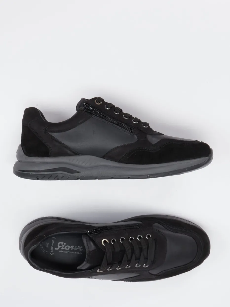 Sportlicher Komfort trifft puristische Eleganz.Sioux kombiniert in dieser Sneaker-Kategorie klassisch-sportliche Linien mit urbanem Understatement. Ideal für den Weg ins Büro oder entspannte Momente im Alltag: Das Modell überzeugt mit einem komfortablen Obermaterialmix aus samtig angeschliffenem Veloursleder und glattem Leder – beide Ton-in-Ton in tiefem Schwarz gehalten. Die Kombination aus Schnürung und seitlichem Reißverschluss erleichtert das Anziehen. Dezente Metallösen und das monochrome Design unterstreichen den minimalistischen Stil. Die profilierte Gummisohle bietet Trittsicherheit, während das Innenfutter angenehmen Tragekomfort gewährleistet. Harmoniert mühelos mit Chinos und Lederjacke. Ein komfortbetonter Begleiter mit klarer Formsprache – made by Sioux.