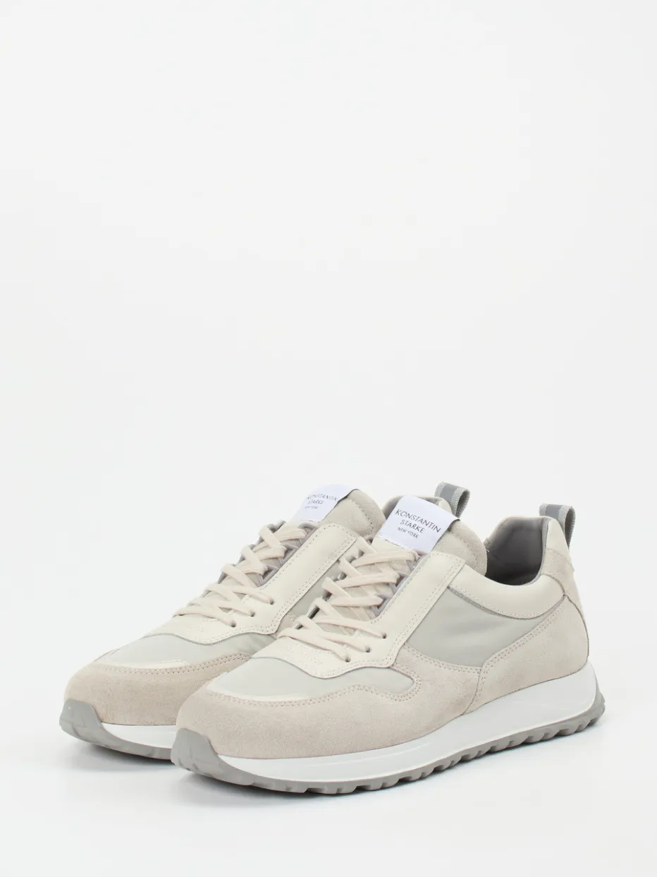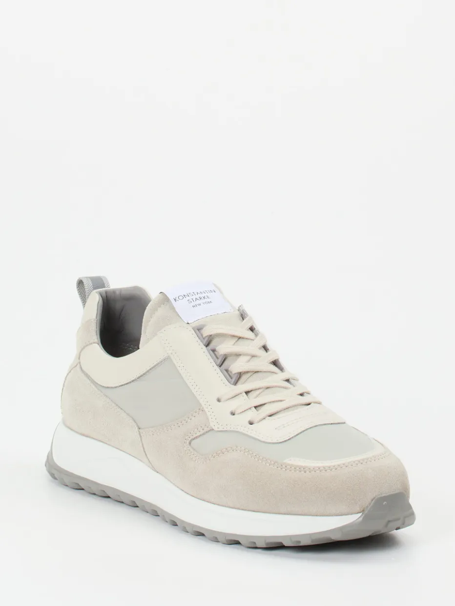 Minimalismus trifft Retro-Dynamik.Konstantin Starke interpretiert die Sneaker-Kategorie mit diesem Unisex-Retro-Modell modern und klar. Ideal für urbane Alltagsmomente, vereint der Sneaker hochwertiges Veloursleder, synthetisches Glattleder sowie luftig gewebtes Mesh in einem fein nuancierten Beigegrau mit hellgrauen Akzenten. Die sportlich-dynamische, low-cut Silhouette steht auf einer profilierten Gummisohle mit Outdoor-Anmutung. Dezente Komponenten wie eine textile Zuglasche und Ton-in-Ton-Nähte betonen den cleanen Look. Dieses Modell passt hervorragend zu minimalistischen Casual-Outfits. Mit zurückhaltendem Design und erstklassiger Verarbeitung bietet Konstantin Starke einen stilvollen Alltagsbegleiter mit funktionalem Komfort.