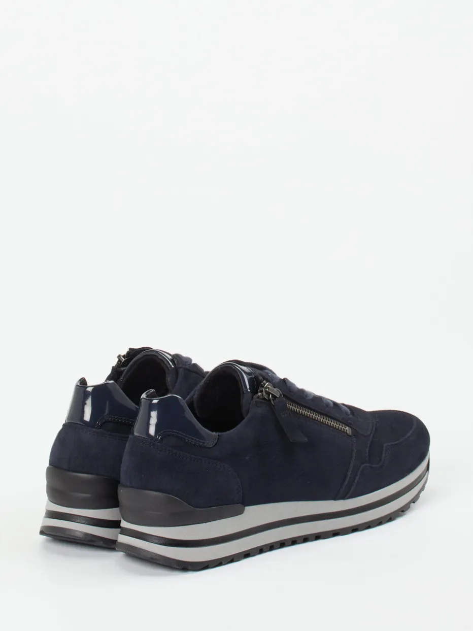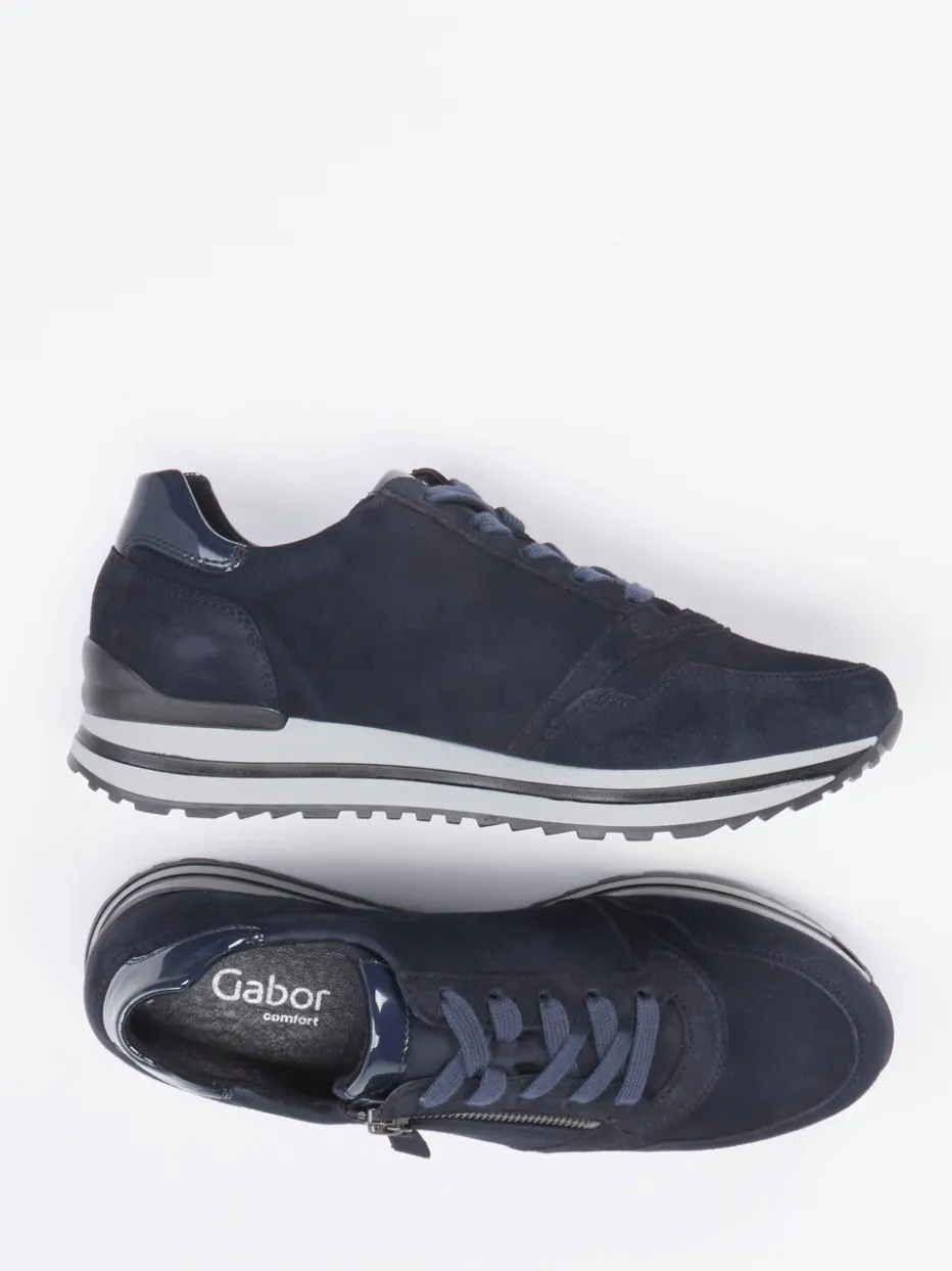 Modernes Understatement trifft Komfort.Der Sneaker von Gabor Comfort überzeugt als bequemer Alltagsbegleiter mit dezenter Sportlichkeit. Ob beim Stadtbummel oder auf dem Weg ins Lieblingscafé – das samtig matte Veloursleder in elegantem Dunkelblau bringt Komfort stilvoll auf den Punkt. Hochwertige Lackleder-Akzente an Ferse und Zunge setzen glänzende Akzente. Der seitliche Reißverschluss erleichtert das Anziehen, während das gepolsterte Fußbett und die profilierte Gummisohle für Standfestigkeit sorgen. Minimalistische Linien treffen auf praktische Details – ideal für cleane Casual-Looks mit Steppjacke und Crossbody-Bag. Gabor Comfort steht für stilvolles Design mit kompromisslosem Wohlgefühl.