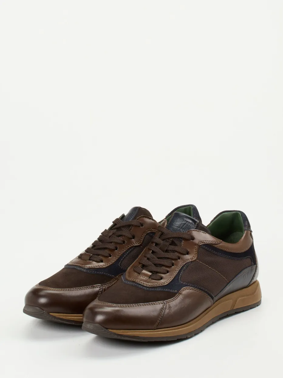 Stilvoll durch Alltag und Büro.Galizio Torresi präsentiert mit diesem Herren-Sneaker ein Modell, das sportiven Komfort und klassische Eleganz vereint. Ein vielseitiger Begleiter für urbane Nachmittage oder relaxte Büro-Outfits: Der Sneaker kombiniert hochwertiges Veloursleder mit atmungsaktivem Mesh und glattem Kalblederfutter. Die dunkelbraune Hauptfarbe wird durch navyblaue und mittelbraune Akzente raffiniert ergänzt. Tonige Ziernähte, das markentypische Wording am Einstieg sowie strukturierte Seitenpartien setzen optische Highlights. Komfortdetails wie der gepolsterte Schaft und das auswechselbare Fußbett unterstreichen den praktischen Alltagsnutzen. Retro-Running-Elemente treffen auf „Quiet Luxury“-Charme. Ein authentisches Statement für maskuline Lässigkeit mit italienischer Handwerkstradition.