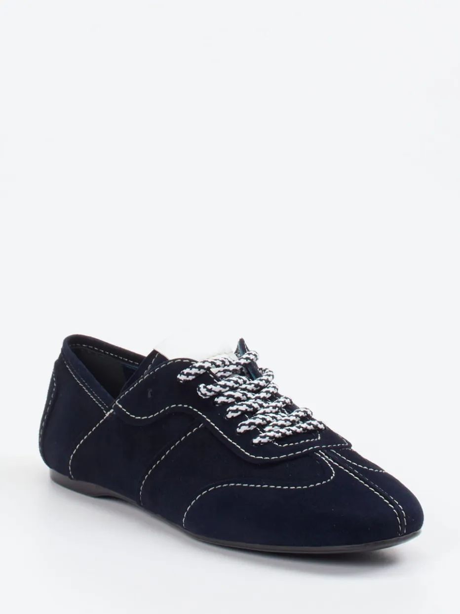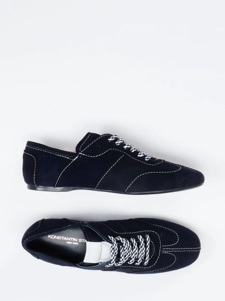 Minimalismus trifft Retro-Stil.Die Marke Konstantin Starke präsentiert mit diesem Sneaker ein modisch zurückhaltendes Modell für Alltag und Büro. Design und Funktion verbinden sich hier in einem schmal geschnittenen Casual-Sneaker aus feinsamtigem Veloursleder in Dunkelblau. Weiße Kontrastnähte und zweifarbige Schnürsenkel setzen dezente visuelle Akzente, während die schwarz profilierte Gummisohle sicheren Halt bietet. Die gepolsterte Ferse, das hochwertige Kalblederfutter und die flache Form sorgen für Komfort im urbanen Alltag. Inspiriert vom „Quiet Luxury“-Trend zeigt sich diese Silhouette zeitlos mit Anleihen aus der Retro-Sportswear. Ein vielseitiger Klassiker mit subtiler Designkompetenz von Konstantin Starke.