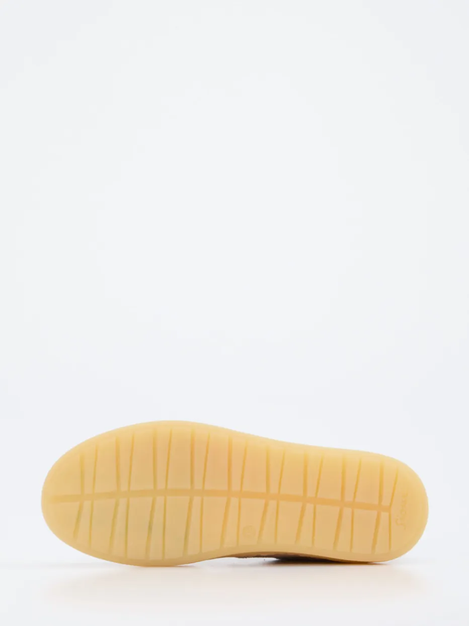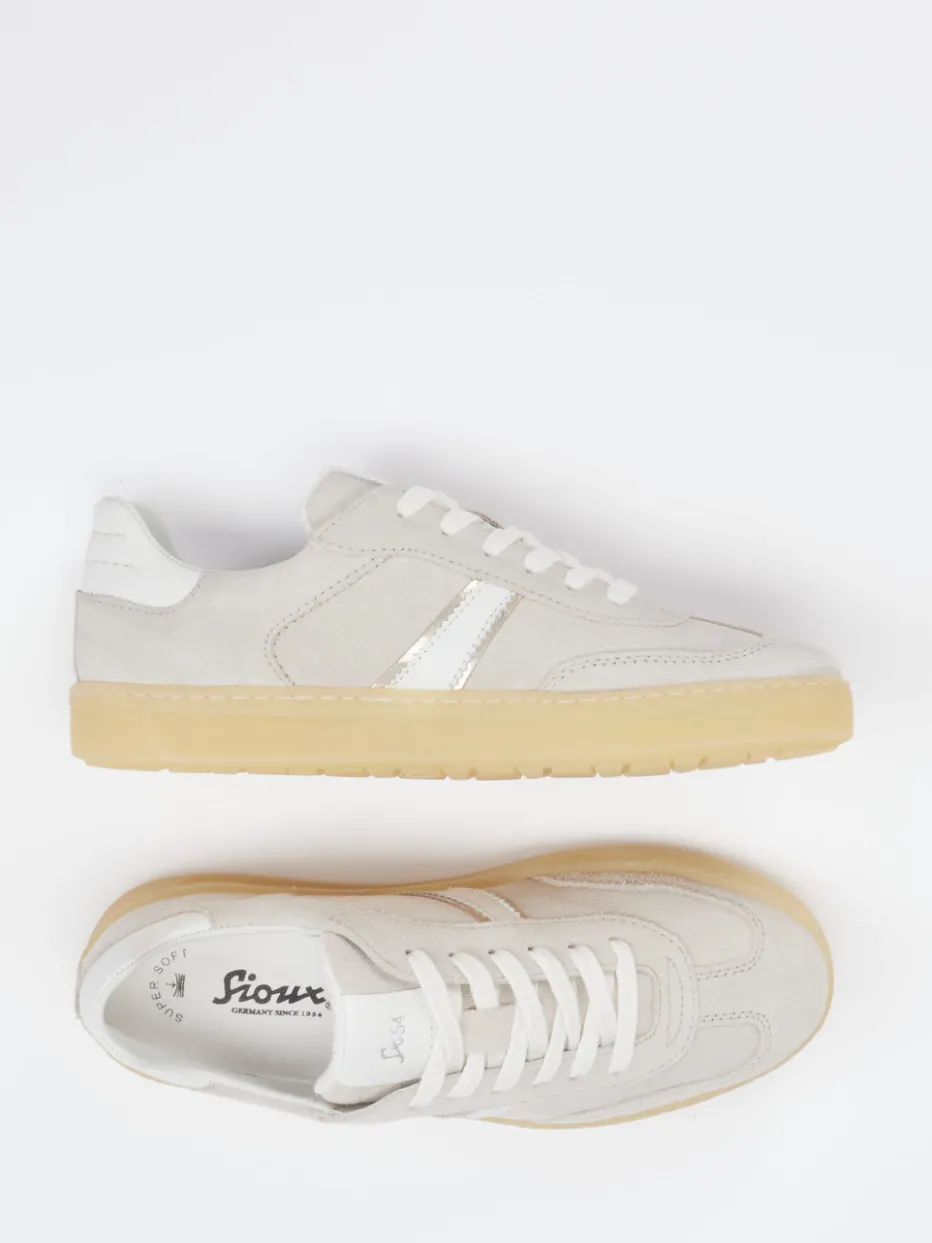 Moderner Alltagsbegleiter mit Retro-Charme. Sioux präsentiert einen Low-Top-Sneaker für entspannte Freizeitmomente. Das Modell aus beigegrauem Veloursleder überzeugt mit matter Oberfläche und klassisch flacher Silhouette. Akzente setzen weiße Kontraststreifen und eine honigfarbene Gummisohle, die den Retro-Look unterstreichen. Ein gepolsterter Fersenbereich sowie ein textilgefüttertes Innenleben erhöhen den Tragekomfort. Der Schnürverschluss sorgt für verlässlichen Halt. Ideal für Casual-Outfits mit Chinohose und T-Shirt – perfekt für den „Quiet Luxury“-Trend. Sioux verbindet bewährte Bequemschuh-Kompetenz mit stilsicherer Zurückhaltung.