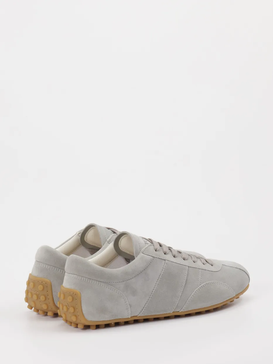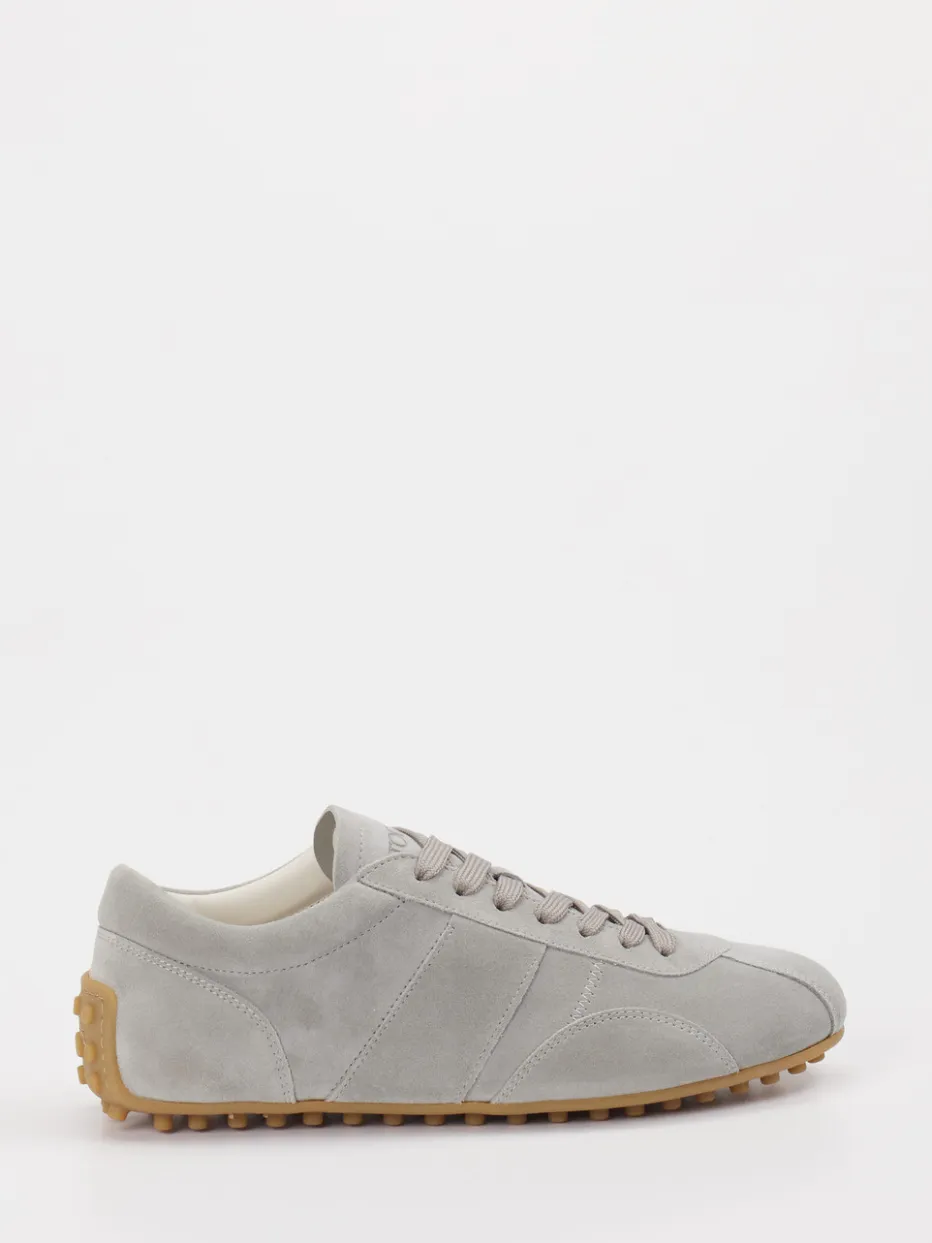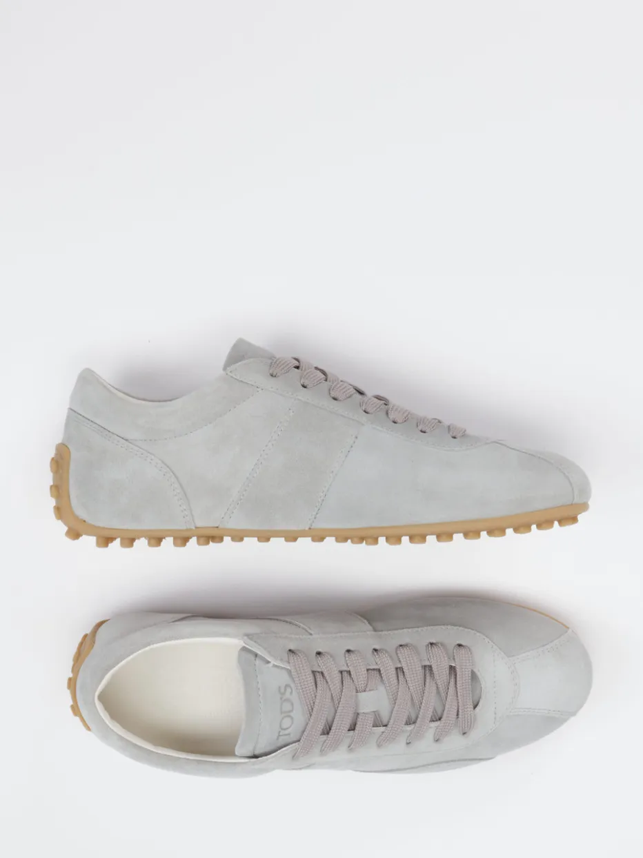 Feinheit in jedem Schritt. Tod’s präsentiert mit diesem Sneaker ein Modell im Retro Runner-Stil. Für entspannte Tage oder stilvolle Freizeitoutfits bietet dieser flach geschnittene Sneaker aus weichem Veloursleder hohen Tragekomfort. Das hellgraue Obermaterial mit matter Oberfläche wird durch tonale Nähte und eine dezente Logo-Prägung auf der Zunge veredelt. Eine profilierte Gummisohle mit Noppenstruktur sorgt nicht nur für sicheren Halt, sondern verleiht dem Modell seine charakteristische Optik. Sein minimalistischer Look mit 90er-Jahre-Akzent trifft den aktuellen „Quiet Luxury“-Trend. Ideal kombinierbar mit legerer Stoffhose oder monochromen Casual-Stücken. Ein dezenter Luxus-Sneaker mit markentypischer Handwerkskunst von Tod’s.