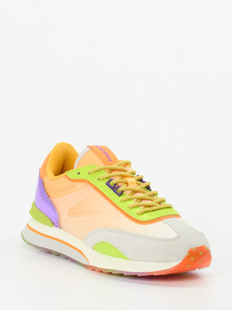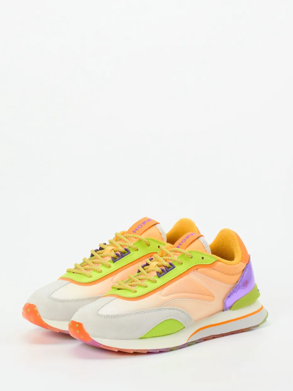 Farbexplosion im Retro-Look.THE HOFF BRAND interpretiert den klassischen Retro-Sneaker neu. Für ausdrucksstarke Alltags-Looks oder urbane Urlaubs-Outfits verbindet dieses Modell samtig angeschliffenes Veloursleder mit atmungsaktivem Mesh, Metallic-Elementen und kontrastierenden Neonakzenten. Pfirsichorange, Lila und Neongrün treffen auf eine durchsichtige Profilsohle mit floralem Muster – ein ungewöhnlicher Blickfang. Die klassische, niedrig geschnittene Silhouette mit gepolstertem Schaft und Memory-Foam-Fußbett sorgt für ganztägigen Komfort. Inspiriert vom Y2K-Trend ist dieser Schuh ein Must-have für trendorientierte Streetwear. Ein visuelles Statement mit hohem Tragekomfort und gestalterischer Raffinesse.