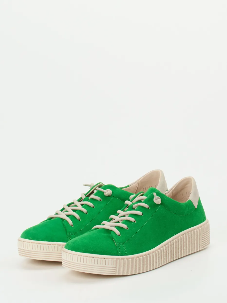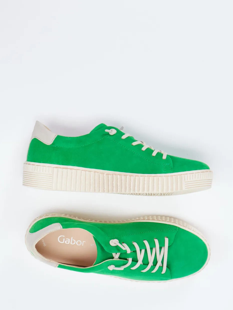 Sommerlicher Eyecatcher für den Alltag.Gabor präsentiert einen femininen Low-Top-Sneaker aus Veloursleder für entspannte Street-Looks. An sonnigen Tagen bringt der grasgrüne Farbton dieses Modells frische Impulse in urbane Outfits. Das samtig-matte Veloursleder überzeugt durch seine weiche Haptik, ergänzt um eine bequeme Plateaugummisohle mit Used-Finish. Tonale Nähte und ein beigefarbener Kontrastbesatz an der Ferse unterstreichen das minimalistische Design. Die profilierte Sohle bietet sicheren Halt, ein gepolstertes Wechselfußbett erhöht den Tragekomfort. Passend zum „Bold Colors“-Trend der Saison lässt sich dieser Sneaker besonders gut mit hellen Sommerjeans kombinieren. Gabor vereint modischen Anspruch mit funktionaler Leichtigkeit.