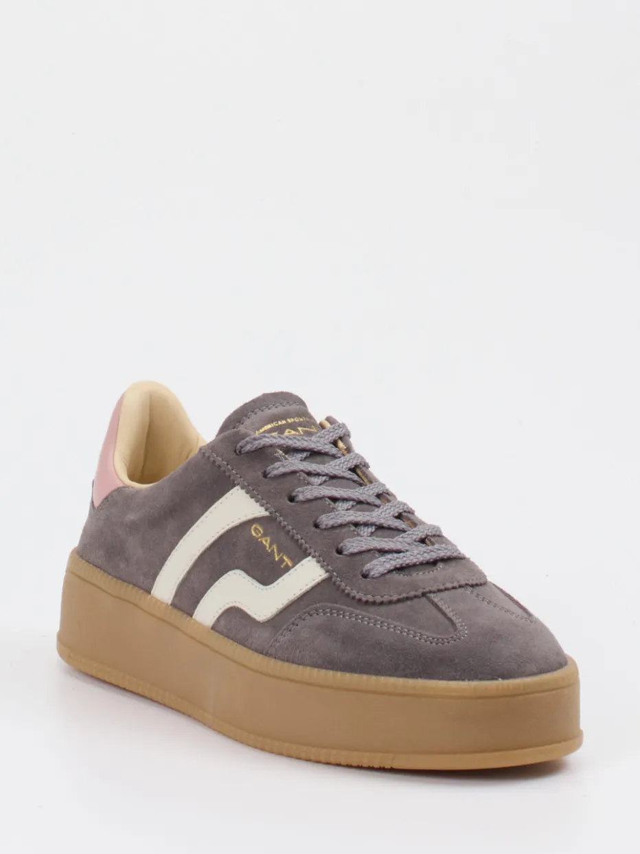 Retro-Flair neu interpretiert.Gant setzt bei diesem Damen-Sneaker auf eine stilvolle Kombination aus Minimalismus und Sportswear-Ästhetik. Ideal für entspannte Tage im Alltag überzeugt das Modell durch samtig angeschliffenes Veloursleder in Schlammgrau und kontrastierende Designelemente: ein roséfarbener Fersenbesatz, cremeweiße Seitenstreifen und ein goldfarbener Logo-Print setzen visuelle Akzente. Die strukturierte Gummisohle im angesagten Plateau-Look unterstreicht den Retro-Charme. Dank klassisch-runder Silhouette und komfortabler Innenausstattung ist der Sneaker perfekt für Freizeit und Reisen geeignet. Besonders stimmig wirkt er zu hellen Denim-Looks und naturfarbenen Accessoires. Ein Statement-Modell mit femininer Note und markentypischem Qualitätsanspruch.