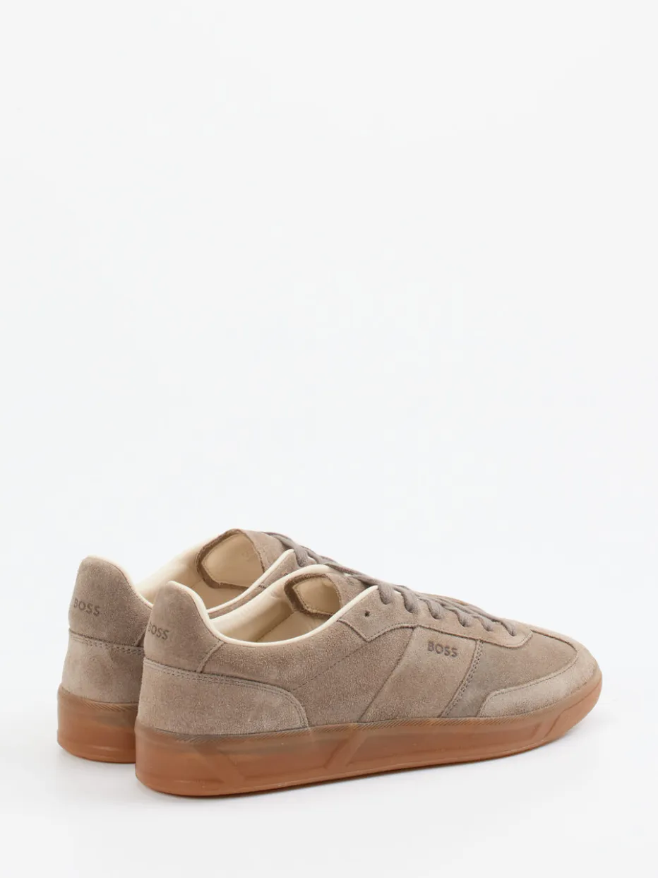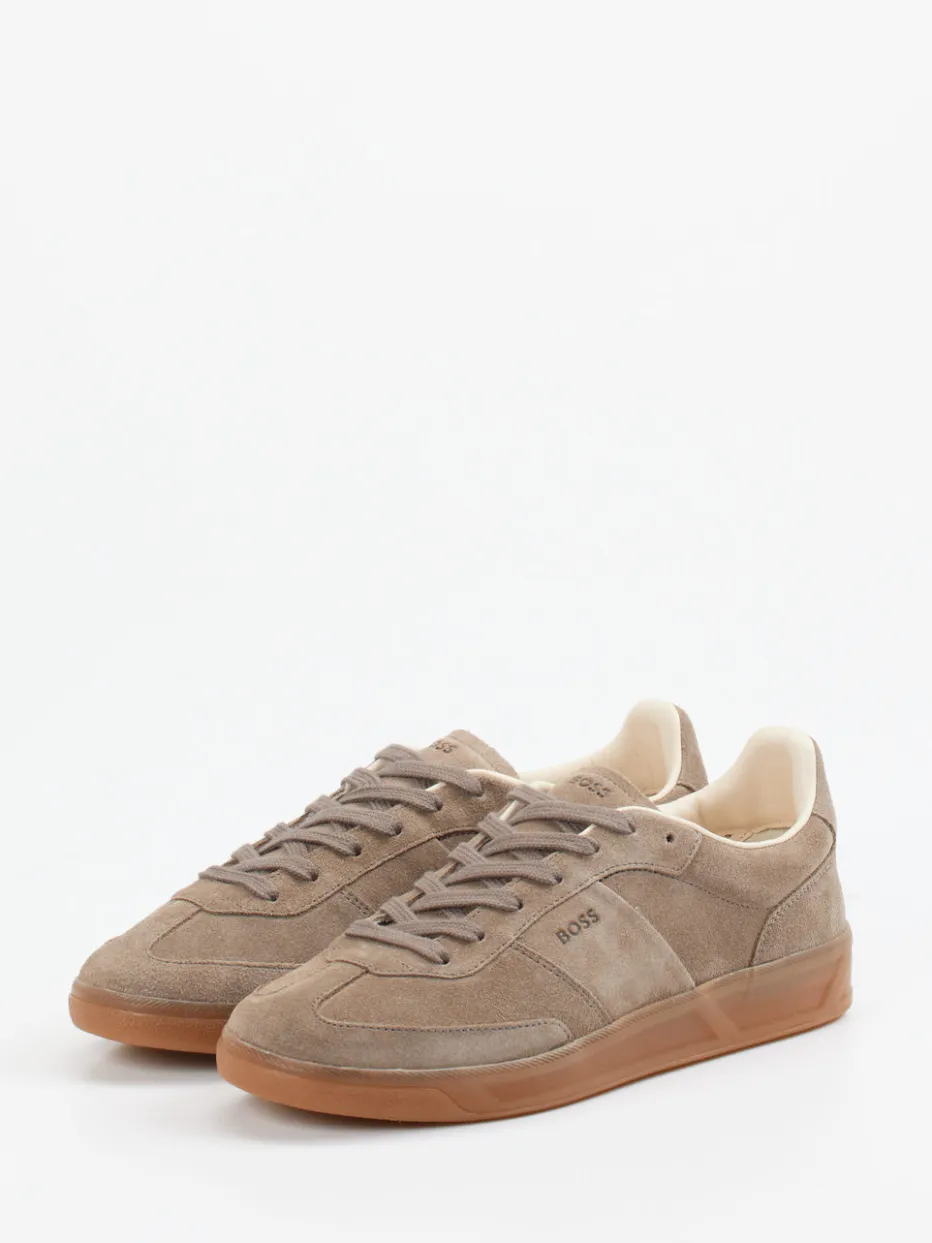 Minimalistischer Luxus trifft Retro-Chic.Der Herren-Sneaker von Boss vereint klare Silhouette und hochwertige Materialien zu einem eleganten Casual-Modell. Ideal für urbane Alltagsszenarien oder das smarte Office-Styling konzipiert, bietet das Modell ein Obermaterial aus samtig angeschliffenem Veloursleder in edlem Taupe. Die flache Form mit tonaler Gummisohle, geprägtem Logo und subtilen Ton-in-Ton-Nähten unterstreicht den minimalistischen Look. Details wie die klassische Schnürung und der gepolsterte Einstieg sorgen für angenehmen Komfort, während die monochrome Farbgebung perfekt zu aktuellen „Quiet Luxury“-Trends passt. Der Sneaker verbindet dezente Eleganz mit markentypischer Finesse – ideal für stilvolle Alltagskombinationen.