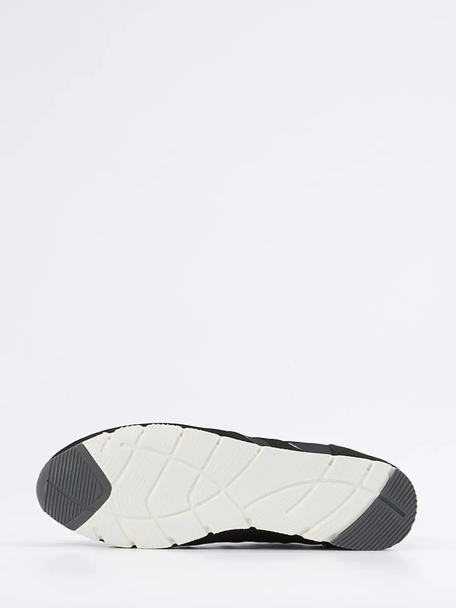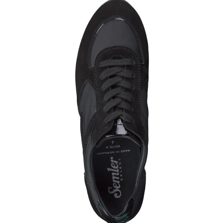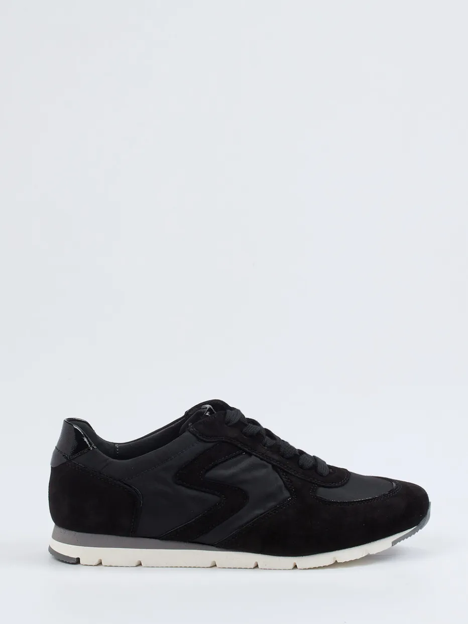 Schwarzes Veloursleder, samtig angeschliffen, trifft auf atmungsaktives Nylon – akzentuiert von glänzenden Lackleder-Einsätzen an Ferse und Zunge. Die flache Silhouette mit breiter Schnürung sorgt für angenehmen Halt, während die weiß-graue Gummisohle mit griffigem Profil sicheren Tritt vermittelt. Mit gepolstertem Wechselfußbett und Weite H ist dieser Low-Top ideal für komfortaffine Trägerinnen. Setzt sportive Akzente zu Jogpants, Stretch-Jeans oder monochromen Looks.
