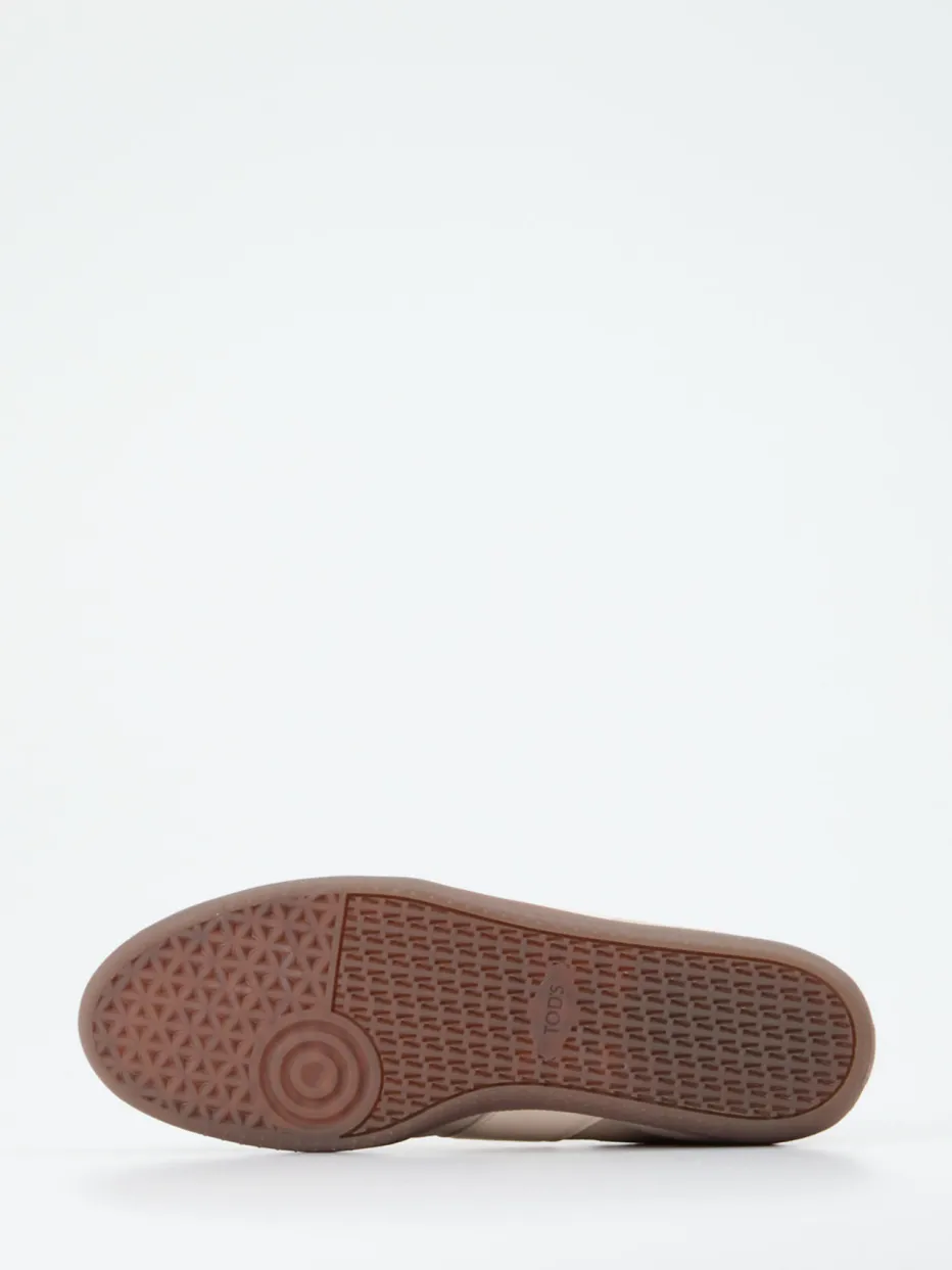 Retro-Neuinterpretation mit Stilgefühl.Tod’s zeigt mit diesem Low-Top-Sneaker für Herren ein Statement urbaner Lässigkeit. Ideal für entspannte Freizeitmomente kombiniert das Modell hochwertiges Veloursleder mit Patch-Einsätzen aus Kalbleder in Ziegelrot, Dunkelblau und Schokobraun. Die matte Oberfläche und dezente Ton-in-Ton-Nähte unterstreichen die wertige Verarbeitung. Die klassische, flache Silhouette mit Schnürung und dekorativen Gummi-Noppen an der Ferse reflektiert den ikonischen 90s-Look in einer modernen Farbgebung – ein klares Bekenntnis zu italienischem Casual-Design. Besonders stilvoll zu Chinohosen oder minimalistischen Outfits. Premium-Tragekomfort mit exklusivem Retro-Charme von Tod’s.