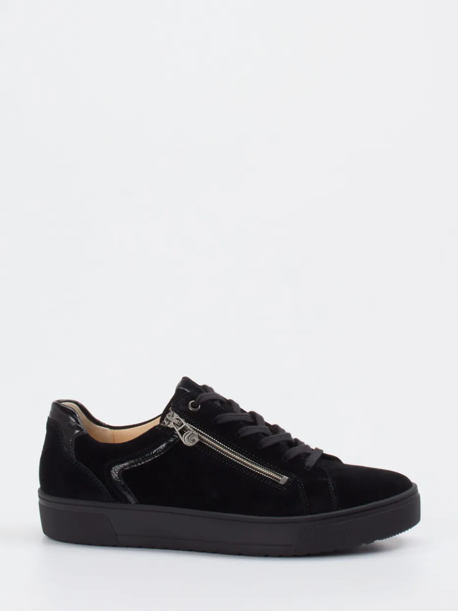 Puristisches Design mit Raffinesse.Ganter präsentiert mit diesem Damen-Sneaker einen stilvollen Begleiter für Alltag und Büro. Samtig strukturiertes Veloursleder in klassischem Schwarz wird durch glänzende Lackleder-Elemente an Ferse und Einstieg ausdrucksstark ergänzt. Die flache Silhouette vermittelt zurückhaltende Modernität, ein seitlicher Reißverschluss erleichtert den Einstieg bei gleichzeitig variablem Schnürungskomfort. Die robuste Gummisohle sorgt für Trittsicherheit, das hochwertige Lederfutter erhöht den Tragekomfort. Inspiriert vom „Quiet Luxury“-Trend überzeugt der Look mit dezenter Eleganz. Besonders harmonisch wirkt die Kombination mit dunkler Slim-Fit-Jeans. Ein durchdachter Allround-Sneaker mit Ganter-Komfort für stilbewusste Minimalistinnen.