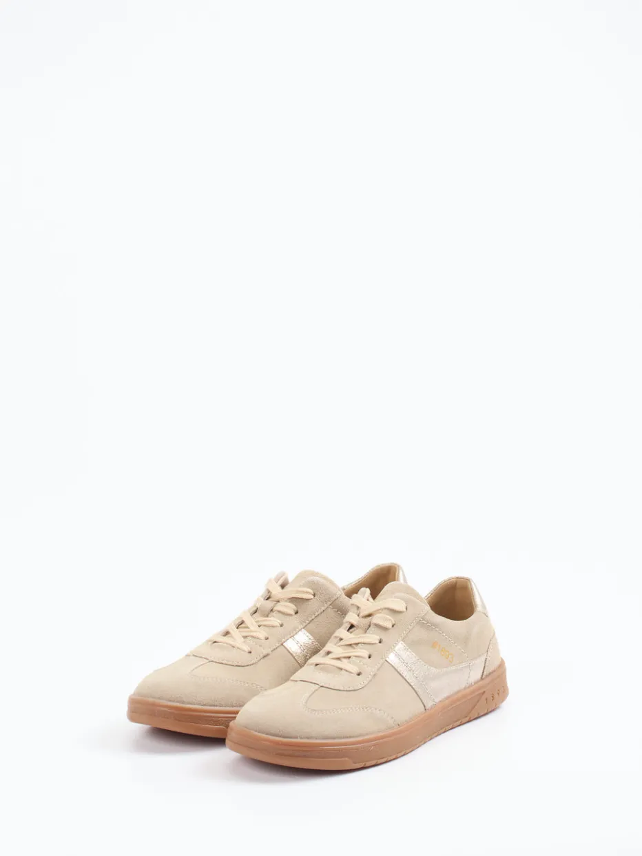 Dieser Sneaker von Richter verbindet hochwertiges Veloursleder mit champagnerfarbenem Metallic-Akzent und bietet dabei klassischen Freizeitkomfort mit subtiler Designnote.