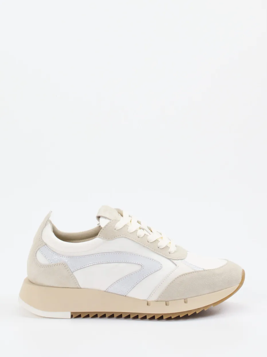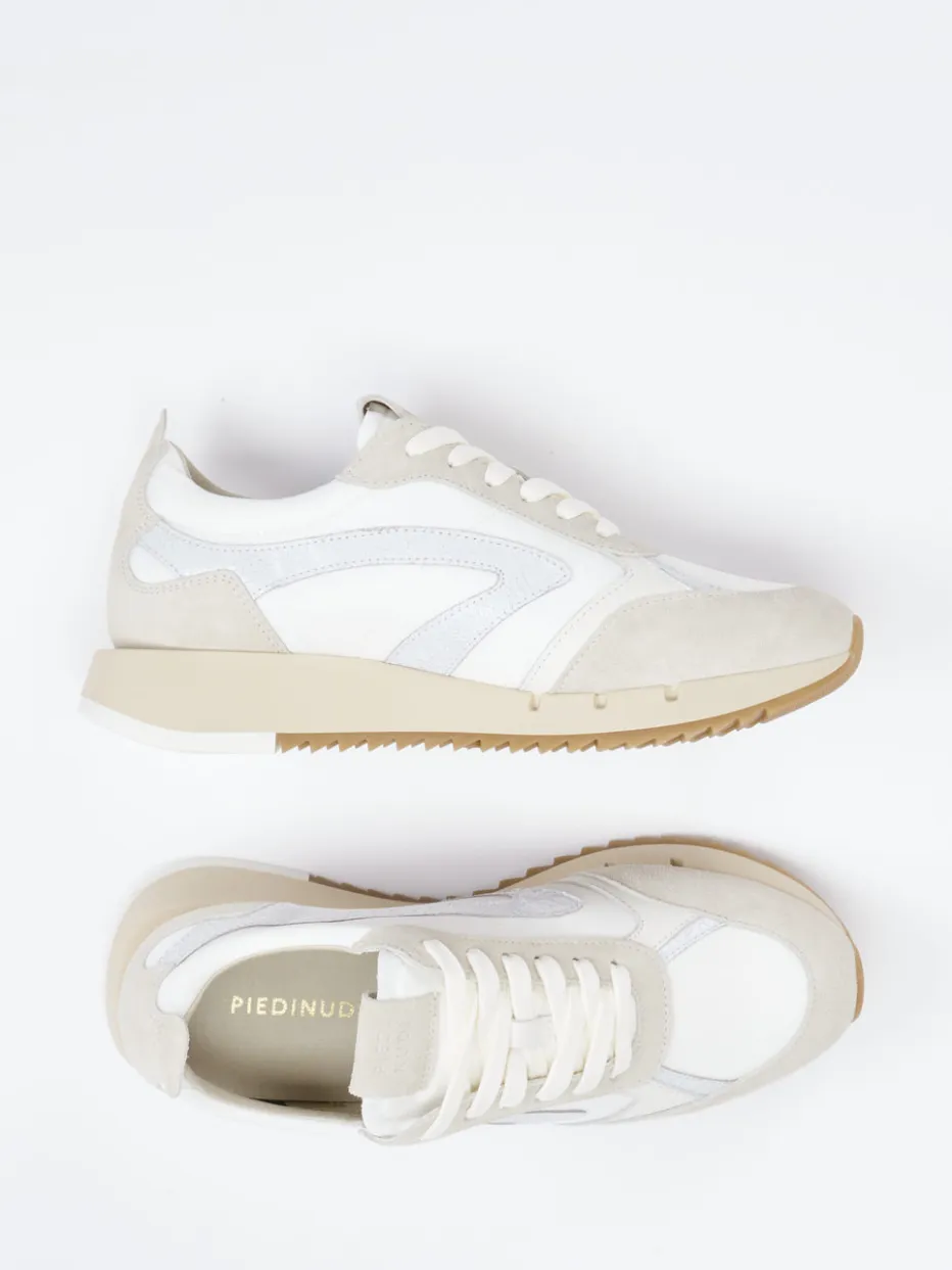 Retro trifft Komfort.Piedi Nudi präsentiert mit diesem Damensneaker ein Modell aus der Kategorie Retro Runner. Für entspannte Stadtausflüge oder den Alltag mit Komfortanspruch bietet der Sneaker mit H-Weite idealen Spielraum. Der Mix aus weißem Textil und sandfarbenem Veloursleder, samtig angeschliffen, verleiht dem Schuh eine matte, edle Optik. Die klassische Lowcut-Silhouette kombiniert Schnürung, ein sanft gepolstertes Lederinnenfutter und ein herausnehmbares Fußbett. Eine beigefarbene, ergonomisch geformte Gummisohle mit tiefem Zackenprofil gewährleistet Trittsicherheit. Das Ton-in-Ton-Design, Zungenlabel und strukturierte Laufsohle ergänzen den minimalistischen Quiet Luxury-Stil. Piedi Nudi vereint handwerkliche Tradition mit innovativem Alltagskomfort.