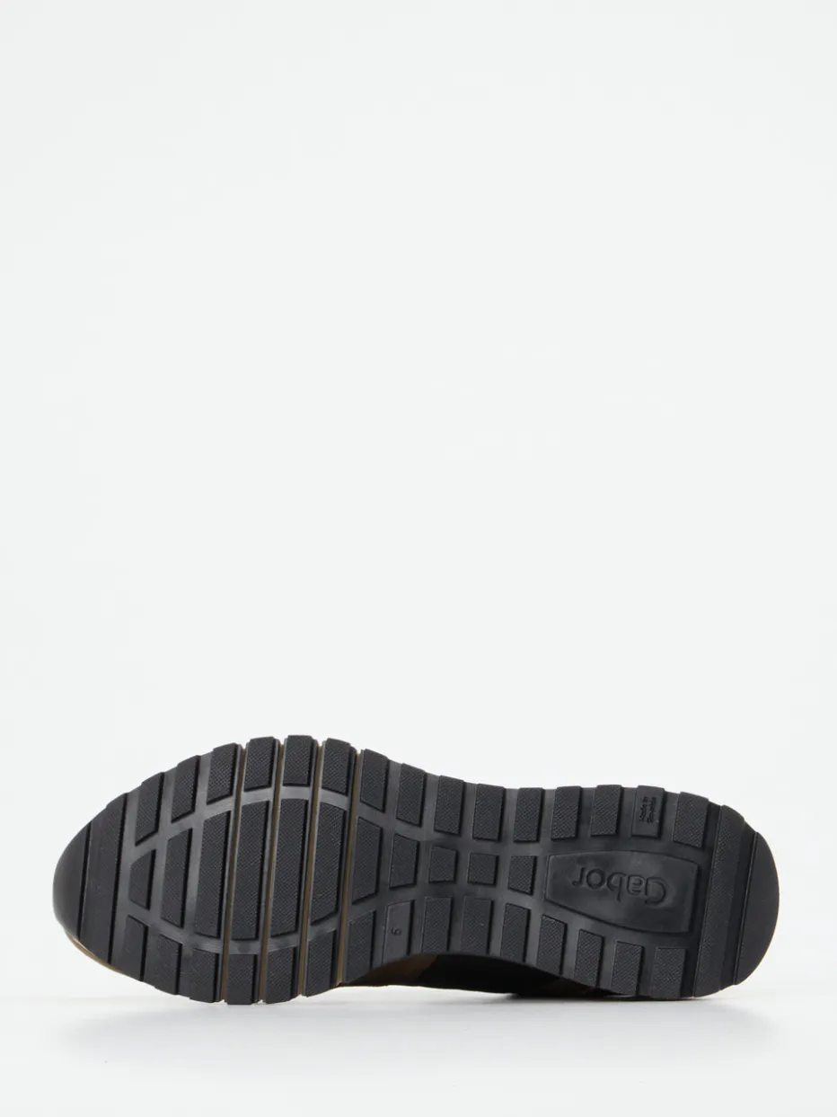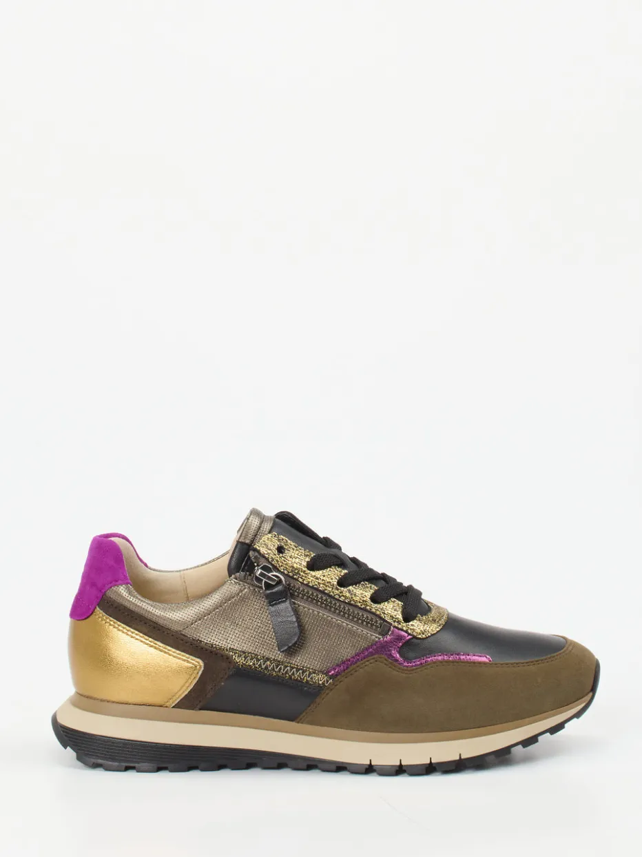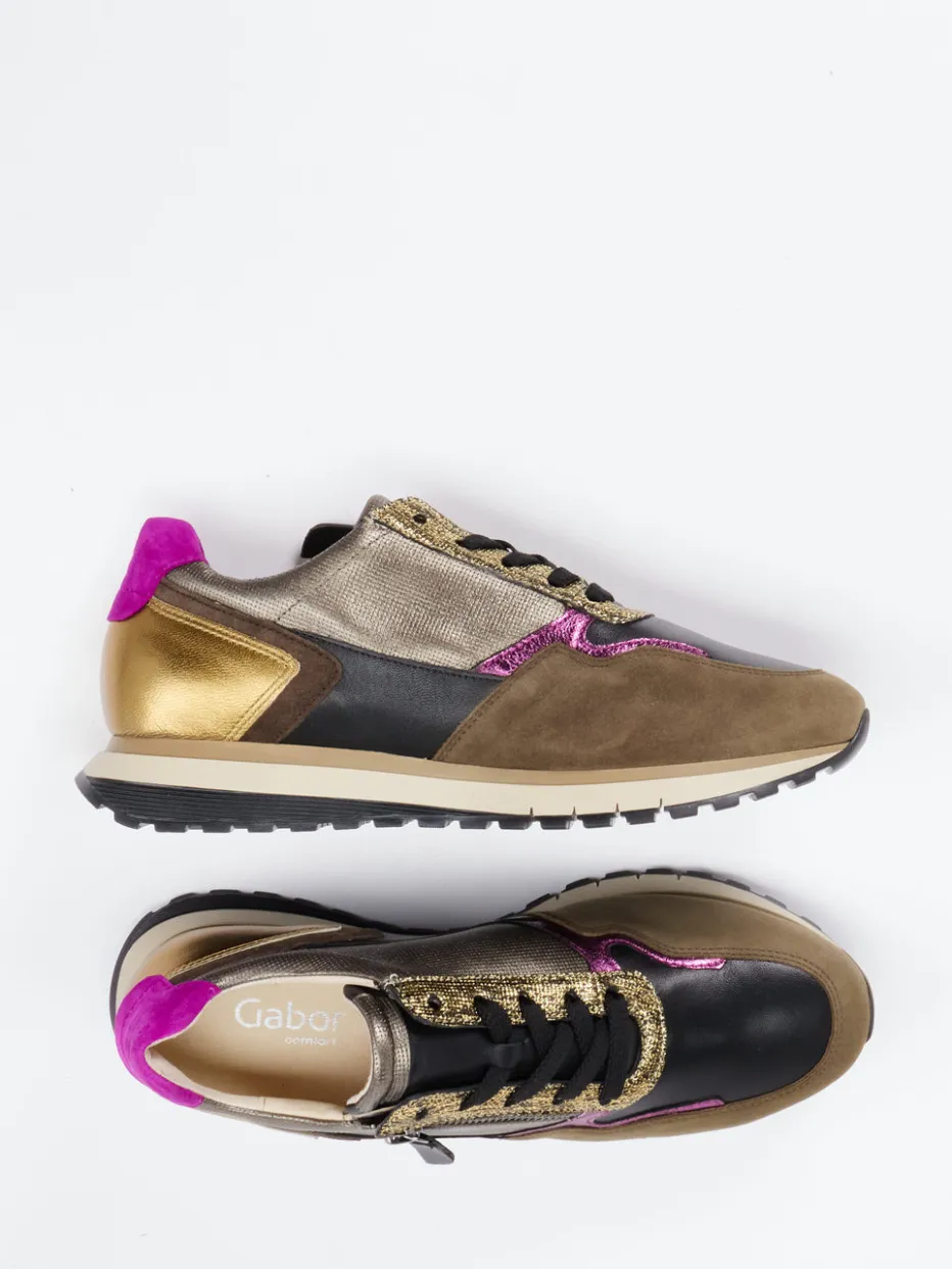 Style trifft Komfort im Streetwear-Trend.Gabor Comfort bietet mit diesem Sneaker ein extravagantes Modell für Damen. Ideal für urbane Alltagsmomente verbindet dieser Low-Top Sneaker ein geschmeidiges Veloursleder mit Glattleder und textilen Mesh-Partien. Der olivbraune Grundton wird durch glänzende Einsätze in Gold und Magenta unterbrochen und wirkt besonders modern. Die klassische Running-Silhouette sowie die mehrteilige Gummisohle mit griffigem Profil bieten hohen Tragekomfort. Der praktische Reißverschluss ergänzt die Schnürung funktional und stilvoll. Perfekte Ergänzung zu Bomberjacke oder Metallic-Bag für trendorientierte Looks. Markentypisch komfortabel mit Weite H und gepolsterter Ausstattung.