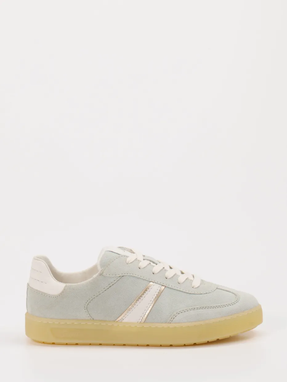 Perfekt für entspannte City-Tage überzeugt der Low-Top-Sneaker mit pastellgrünem Veloursleder und mattem Finish. Weiße Kontraststreifen mit feinem Metallic-Detail setzen ein dezentes Highlight. Die flache Silhouette und der gepolsterte Fersenbereich sorgen in Kombination mit der flexiblen Gummisohle für angenehmen Laufkomfort. Der Retro-Sportswear-Einfluss des Designs harmoniert mit dem angesagten Soft-Neutrals-Trend. Besonders stimmig wirkt er zu luftigen Chinos oder minimalistischen Alltagslooks.
