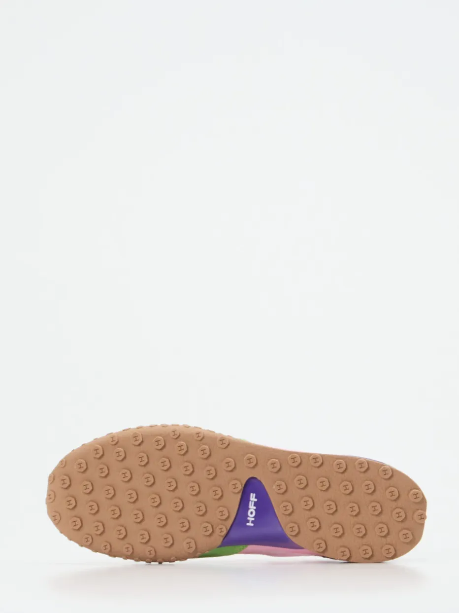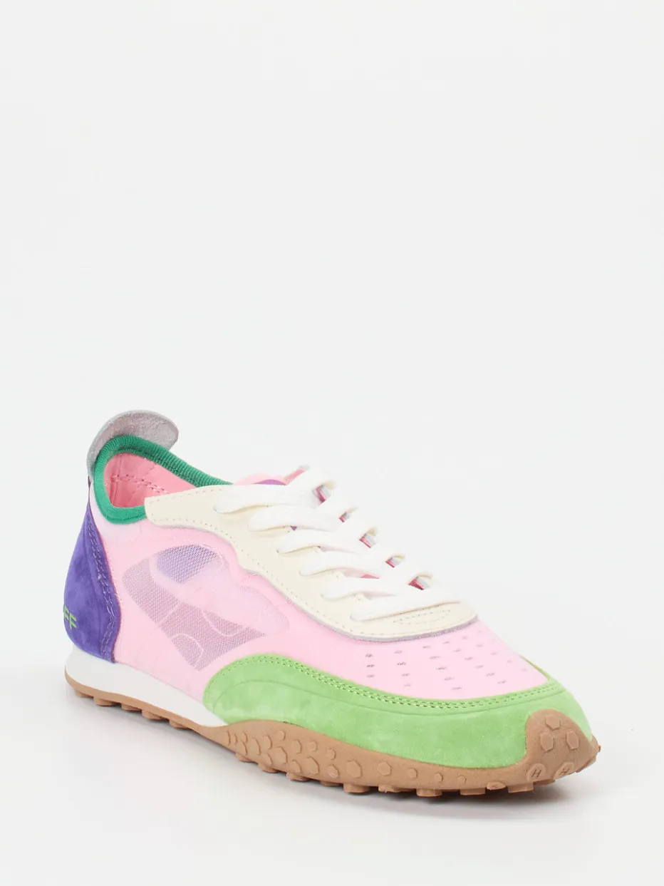 Farbinspiration für urbane Abenteuer.Der THE HOFF BRAND Sneaker überzeugt als Retro Runner mit betont expressivem Stil. Ob unterwegs in der City oder beim entspannten Spaziergang: Das Modell kombiniert rosafarbenes Meshmaterial mit samtig angeschliffenem Veloursleder in Violett, Lindgrün und Elfenbein. Die schmal zulaufende, flache Silhouette wird durch kontrastierende Details und dezentes Markenbranding an Ferse und Zunge ergänzt. Eine profilierte Gummisohle mit 2 cm Absatzhöhe rundet den Look funktional ab. Color-Blocking, Y2K-Anmutung und Komfortelemente wie gepolsterter Schaftrand und Memory Foam-Innensohle machen den Sneaker besonders stylisch. Der modische Anspruch von THE HOFF BRAND spiegelt sich in kreativen Farbwelten und viel Liebe zum Detail wider.