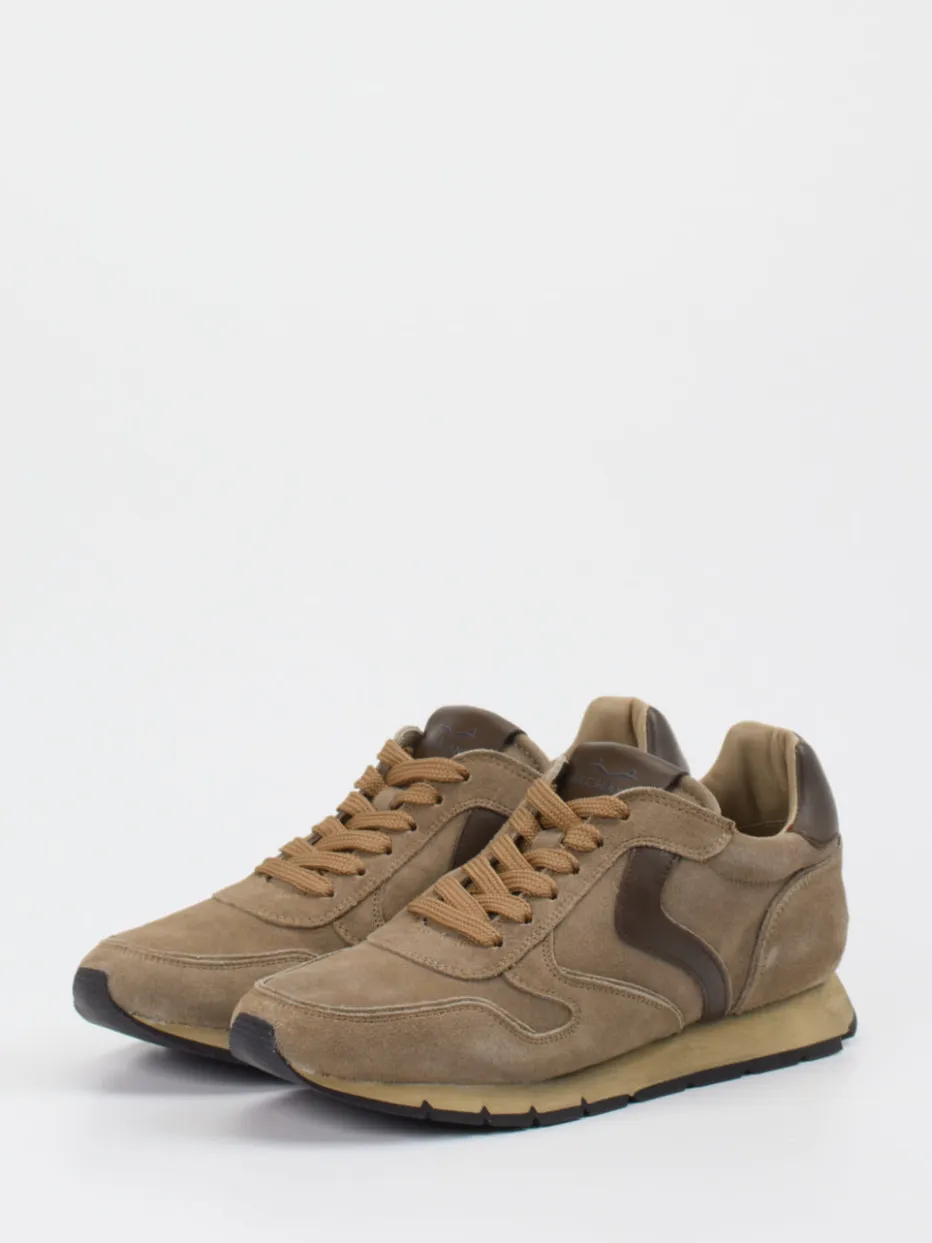 Voile Blanche präsentiert einen Herren-Sneaker der Kategorie Retro Runner, gefertigt aus hochwertigem Velours-/Glattleder-Mix. Ideal für entspannte Alltagsmomente überzeugt das Modell mit seinem sandbeigen Veloursleder, ergänzt durch dunkelbraune Glattlederdetails und matt strukturierter Oberfläche. Die klassisch flache Silhouette mit gepolstertem Schaftrand trifft auf eine zweifarbige Gummisohle mit leichtem Plateau und funktionalem Grip. Dezente Ziernähte und ein seitliches Logo runden das Design harmonisch ab. Stilistisch inspiriert vom 90s-Running-Trend, fügt sich der Sneaker perfekt in casual-orientierte Streetwear-Looks ein. Kombiniert mit Chino oder Jeans entsteht ein authentischer Urban-Style. Voile Blanche steht für komfortbetonten Purismus mit modischer Präzision.
