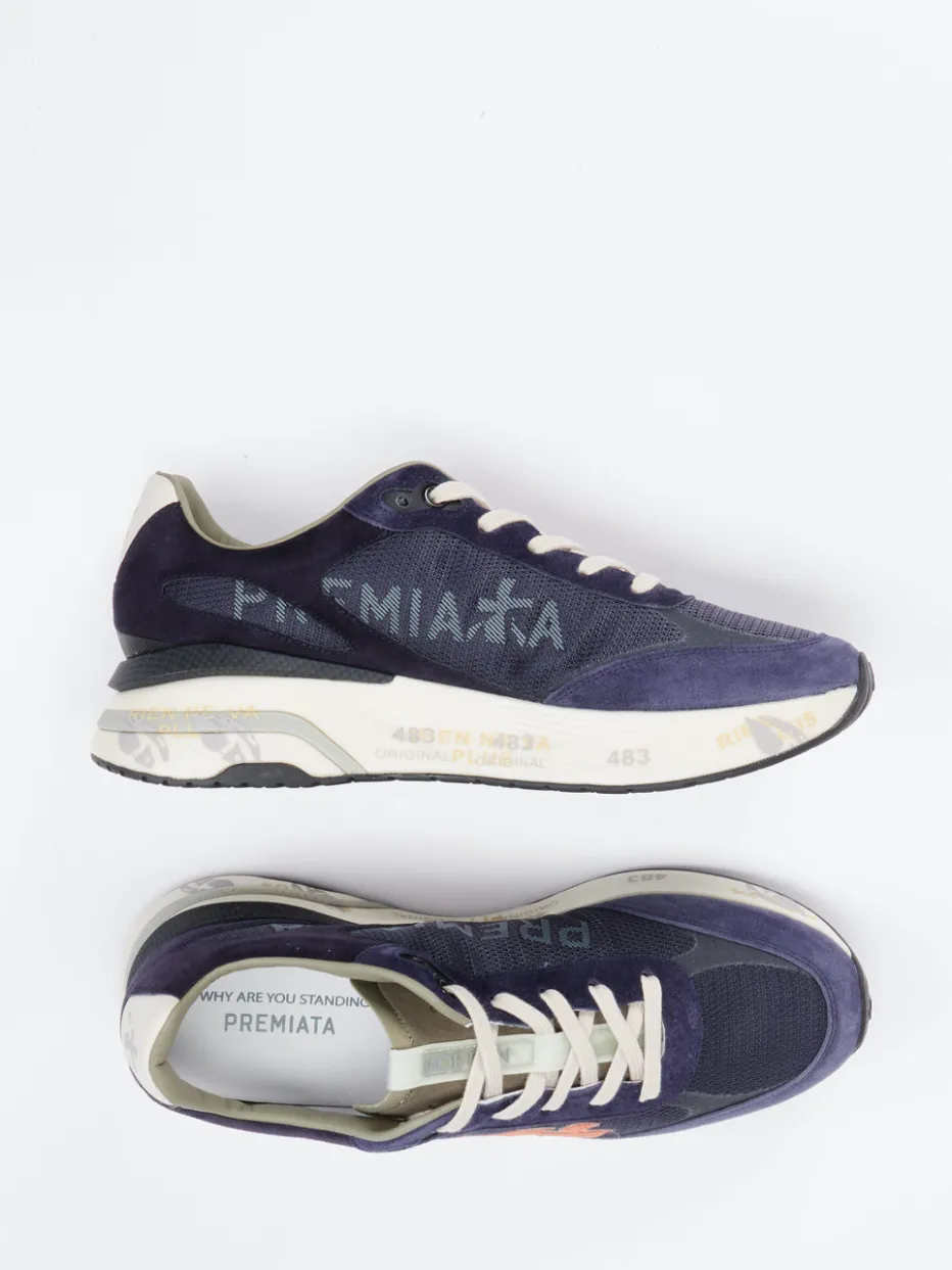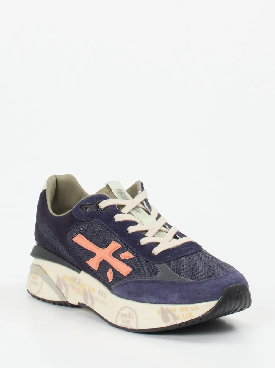Markante Kombination aus Retro und Streetwear.Premiata bietet mit diesem Sneaker ein Statement für sportiven Stil im Alltag. Die Kombination aus dunkelblauem Veloursleder und meshartigem Textil schafft eine spannende Materialtiefe mit angenehmer Haptik. Prägnant gestaltet sich der sportlich-dynamische Schnitt, der durch eine auffällig bedruckte Gummisohle und kontrastfarbenes Logo-Detail in Pfirsichrosa modern akzentuiert wird. Der gepolsterte Einstieg sowie das Lederfutter sorgen für angenehmen Tragekomfort – ideal für Freizeit oder sportive Looks im angesagten Chunky-Sneaker-Trend. Lässt sich hervorragend mit Jogpants oder Oversized-Hoodies stylen. Trendbewusster Komfort mit italienischer Designpräzision.