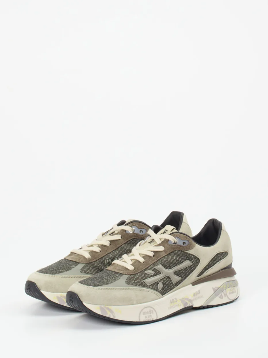 Dieser Premiata-Sneaker kombiniert atmungsaktives Mesh mit weichem Veloursleder in erdigen Tönen. Die mehrlagige Chunky-Sohle verleiht dem Design Struktur und modische Präsenz.