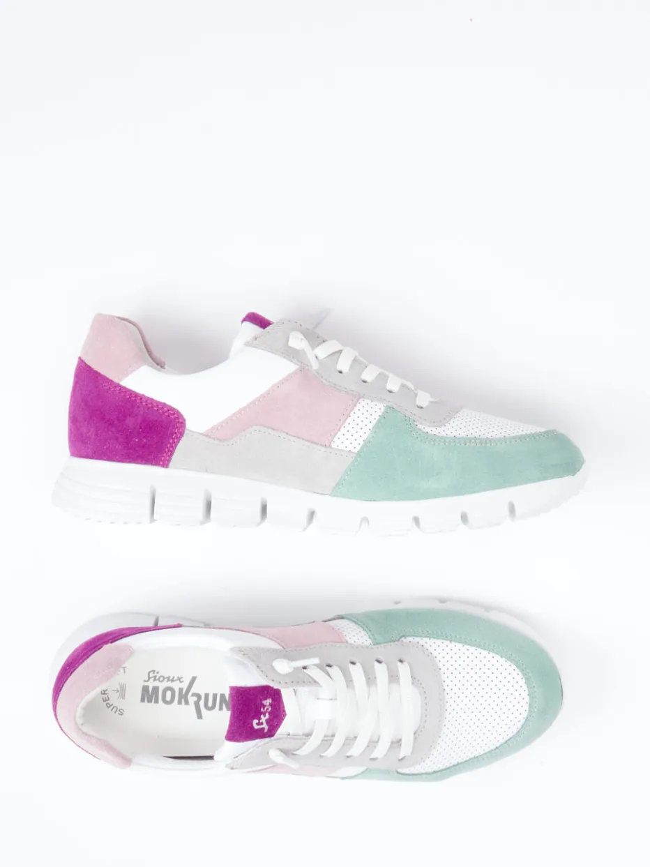Pastell trifft Retro-Sportlichkeit.Der Damen-Sneaker von Sioux vereint sportive Lässigkeit mit trendbewussten Akzenten. Ideal für entspannte Freizeitlooks oder den Weg durch die Stadt: Weiches Veloursleder in samtiger Haptik kombiniert sich mit perforiertem Mesh zu einem atmungsaktiven Tragegefühl. Die dominante weiße Grundfarbe wird durch farbige Overlays in Mintgrün, Altrosa und Pflaume akzentuiert. Die klassische Silhouette mit gepolstertem Schaftrand, Schnürung und flexibler Gummisohle sorgt für angenehmen Komfort – auch bei längeren Wegen. Die Optik greift angesagte Pastell-Trends und Streetwear-Elemente auf. Ein stylischer Wohlfühlsneaker mit markentypischer Leichtigkeit.
