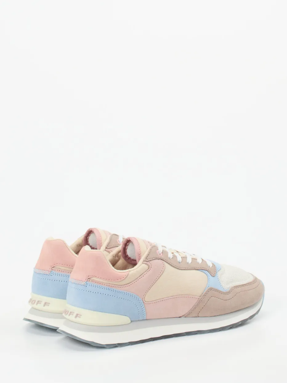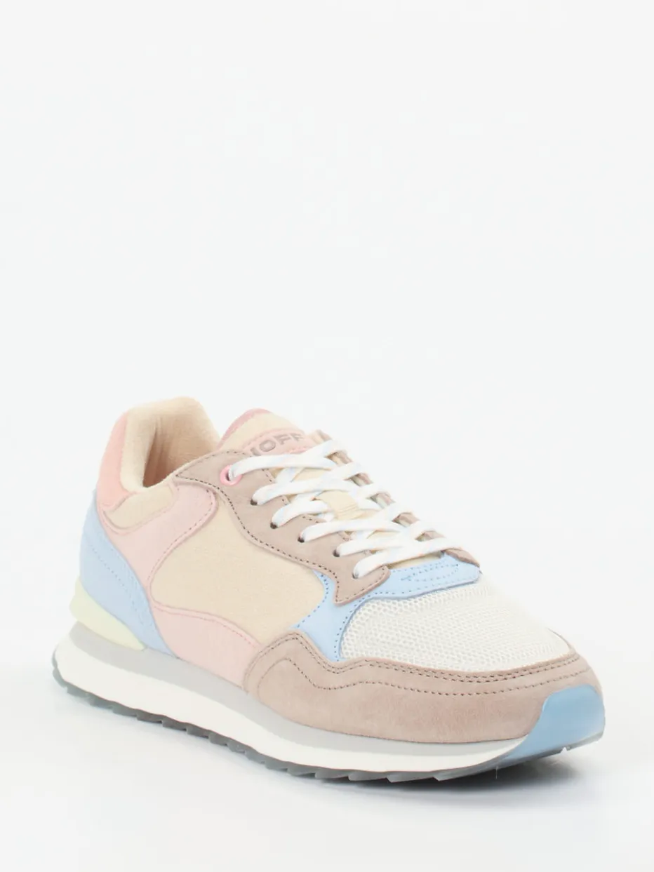 Pastell trifft Retro-Leichtigkeit.THE HOFF BRAND interpretiert den klassischen Retro Runner neu: als pastellfarbenen Sneaker mit femininer Note. Ideal für entspannte City-Walks oder Urlaubstage bei mildem Wetter bringt dieses Modell ein spannendes Materialspiel aus samtigem Veloursleder und luftdurchlässigem Meshtextil mit. Cremebeige, Rosé und Hellblau ergeben einen sanften Farbklang auf der flachen Silhouette mit mehrfarbiger Laufsohle. Die Schnürung sorgt für flexible Passform, die gepolsterte Ferse für zusätzlichen Komfort. Urbane Einflüsse aus Streetwear und Y2K prägen den Look. Kombiniert zu Jeans, Culottes oder Soft Tailoring. Softes Fußbett und visuelle Detailfreude – THE HOFF BRAND setzt modische Akzente mit hohem Komfort.