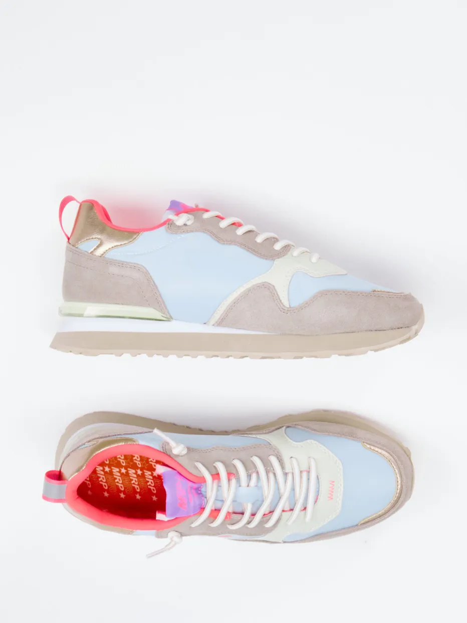 Streetstyle mit Retro-Flair.Der Damen-Sneaker von MRP vereint komfortorientiertes Design mit aktuellen Trenddetails. Ideal für urbane Streifzüge bei mildem Wetter überzeugt dieser Sneaker durch seine Materialkombination aus Veloursleder und Textil mit teils samtiger Oberfläche. Der pastellblaue Grundton wird durch beige und rosa Einsätze sowie neongelbe Logo-Stitchings ergänzt. Eine elastische Schnürung erleichtert das Anziehen, optional mitgelieferte Schnürsenkel erhöhen die Flexibilität. Weitere Highlights wie die Metallic-Fersenkappe und die gepolsterte Einstiegspartie unterstreichen die sportliche Silhouette. Perfekt zu angesagten Streetstyle-Outfits mit hellen Leggings oder Oversized-Hoodies. Markentypischer Materialmix trifft auf clever platzierte Designelemente mit modischem Anspruch.