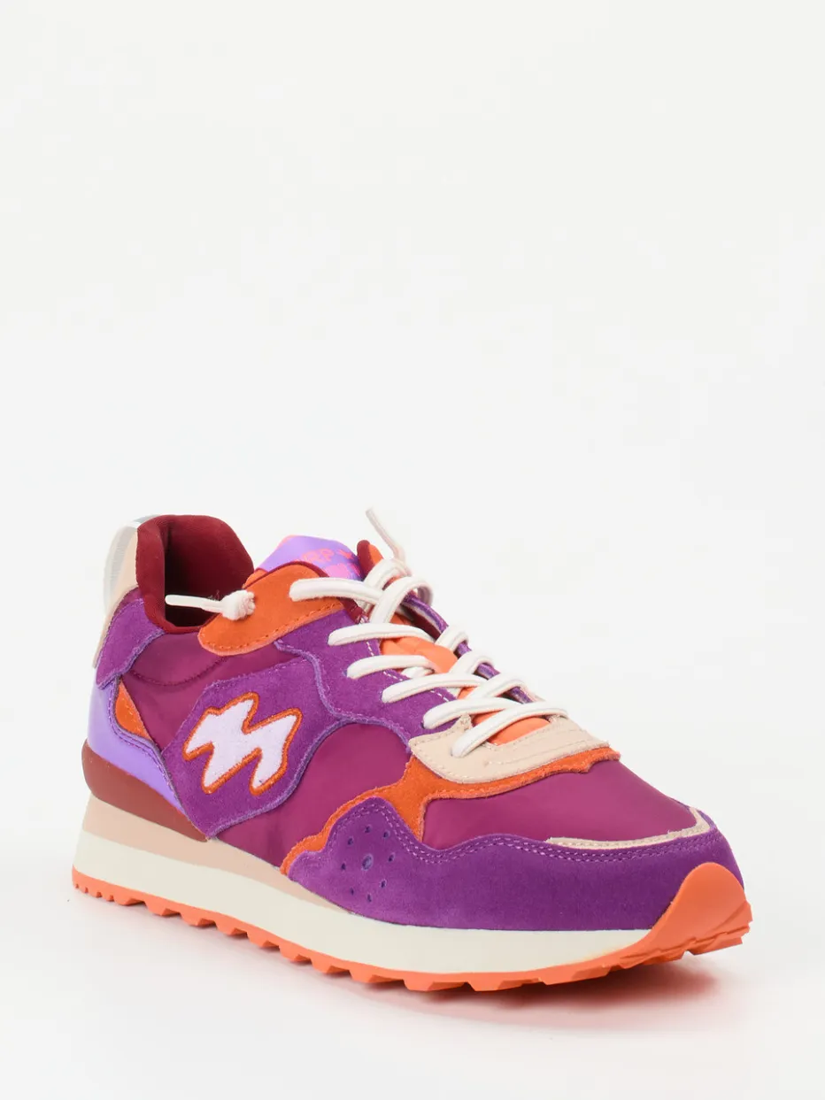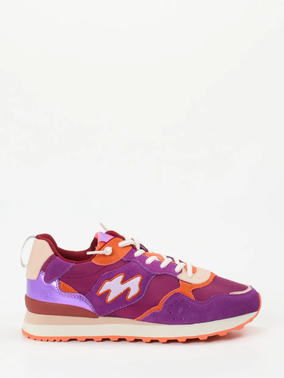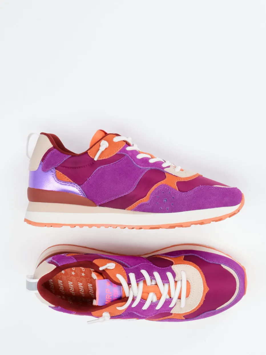 Retro trifft auf Color-Blocking.Der Sneaker aus dem Hause MRP begeistert als moderner Retro-Runner für Streetwear-Looks. Ein dynamisches Farbspiel aus Purpur, Orange und Beige prägt das Design, ergänzt durch kontrastierendes Metallicleder in Violett und ein Markenlogo auf der Zunge. Samtig angeschliffenes Veloursleder und toniges Nylon erzeugen eine vielschichtige, matte bis leicht glänzende Optik. Die flache Silhouette, ein reflektierender Fersenclip und die robuste Gummisohle mit Grip sorgen für Aufenthalt auf urbanem Terrain. Elastschnürung mit Alternativbändern erlaubt flexible Styles. Dieser Sneaker spiegelt den angesagten Y2K-Trend und bringt Farbe in jede Freizeitgarderobe. Trendstarkes Statement-Piece mit unverwechselbarem MRP-Appeal.