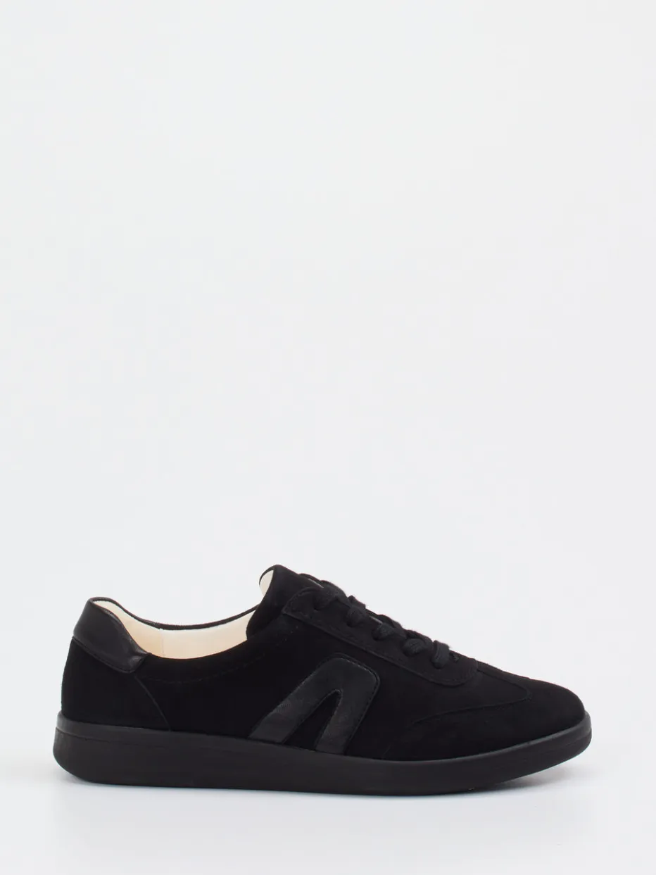 Schwarz in Bestform.Christian Dietz präsentiert mit diesem Low-Top-Sneaker ein vielseitiges Modell für unbeschwerte Casual-Momente. Ob beim Stadtbummel oder auf dem Weg zum Café – der Sneaker überzeugt mit samtig angeschliffenem Veloursleder und tonalen Glattleder-Applikationen in tiefem Schwarz. Die klassische, runde Silhouette trifft auf eine gepolsterte Ferse und ein weiches Innenfutter aus Leder. Dank Schnürung, PU-Sohle und weichem Fußbett bietet er angenehmen Laufkomfort. Der unaufgeregte Look passt ideal zu monochromen Styles im Zeichen ruhiger Eleganz. Ein stilvolles Statement der Bequemlichkeit im Alltag – mit ruhiger Materialästhetik und präziser Verarbeitung.