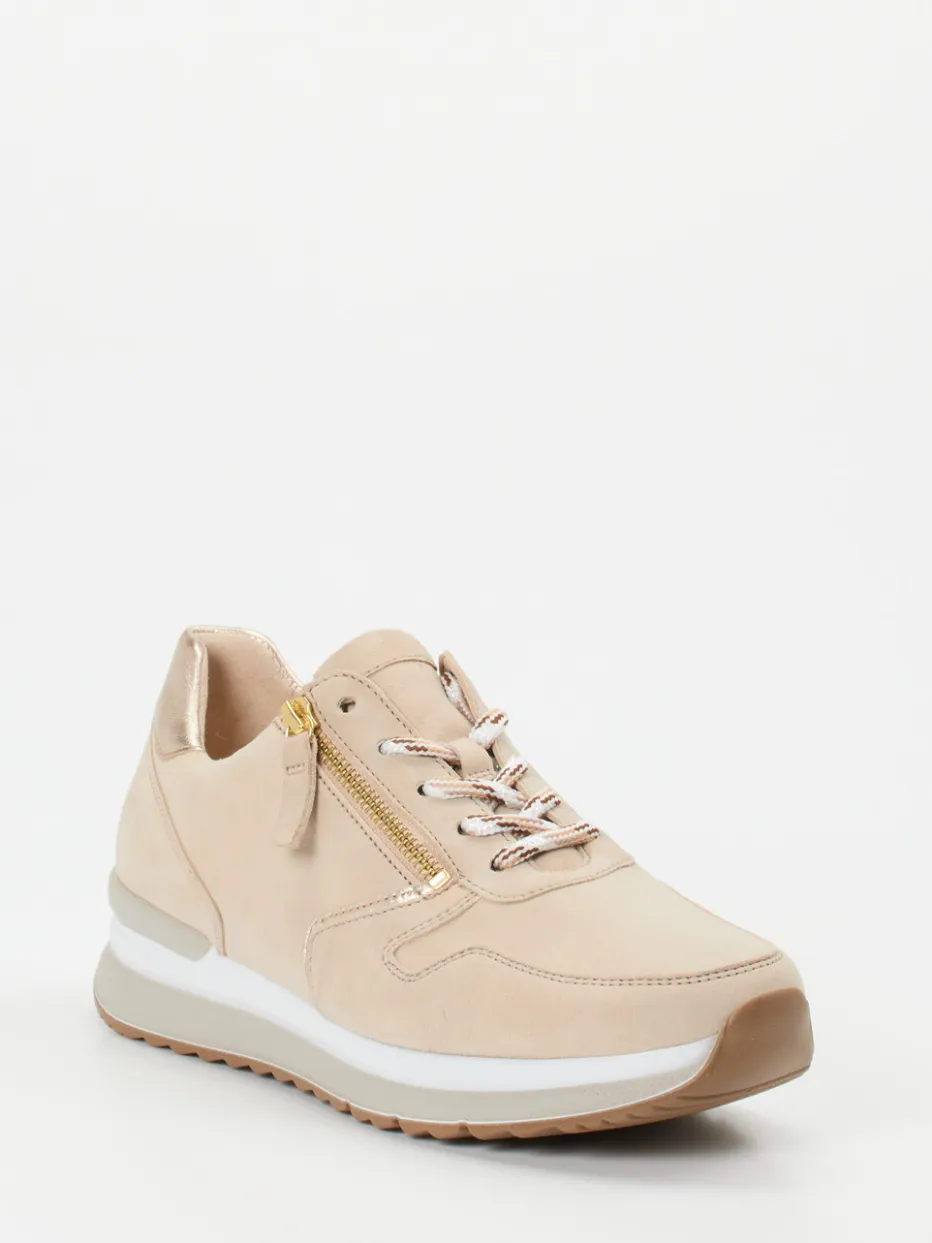 Bequem und stilvoll durch den Alltag.Der Damen-Sneaker von Gabor Comfort vereint Komfort und dezente Eleganz. Ideal für entspannte Alltagsmomente, überzeugt dieses Modell durch beiges Veloursleder mit samtiger Oberfläche. Die Kombination aus Schnürung und goldfarbenem Reißverschluss erlaubt leichtes An- und Ausziehen, während der metallic schimmernde Fersenbereich einen modischen Akzent setzt. Seine klassisch-sportliche Silhouette harmoniert mit minimalistisch inspirierten Outfits der aktuellen Saison. Die gepolsterte Komfortsohle sowie das atmungsaktive Innenfutter aus Leder und Textil sorgen für angenehmes Tragegefühl – auch bei längeren Wegen. Ein stilvoller Komfortschuh mit funktionalen Details aus dem Hause Gabor.