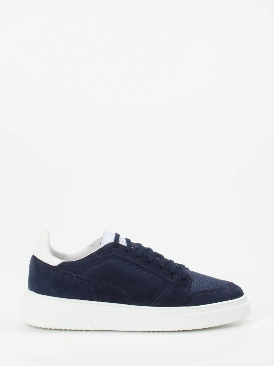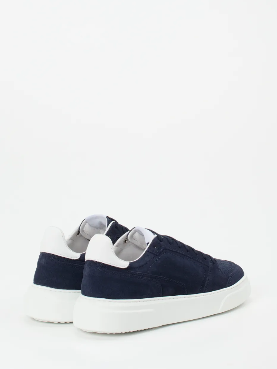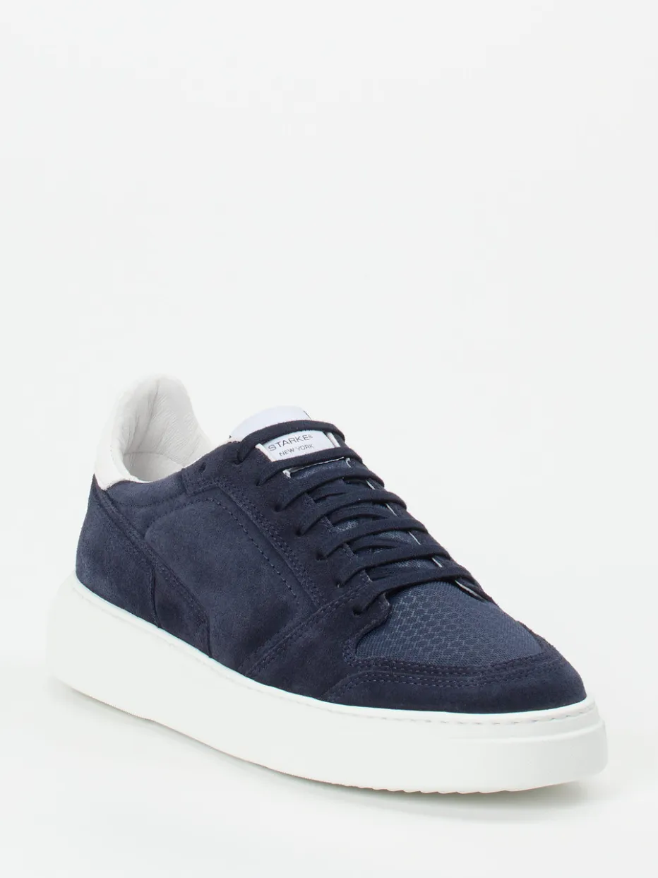 Minimalismus trifft Komfort.Konstantin Starke erweitert das Segment der Herren-Sneaker um ein Modell, das durch klare Linien und angenehme Alltagstauglichkeit überzeugt. Ideal für entspannte City-Outfits oder moderne Homewear kombiniert dieser Low-Top-Sneaker dunkelblaues, samtig angeschliffenes Veloursleder mit strukturierter Mesh-Textur im Vorderfuß. Die weiße Kontrast-Fersenkappe und die monochrome Gestaltung unterstreichen den zurückhaltenden Stil. Innen sorgt eine gepolsterte Ausstattung mit lederbezogenem, herausnehmbarem Fußbett für Komfort. Mit rutschfester Gummisohle, Schnürung und Streetwear-Einfluss bietet er maximale Kombinierbarkeit zu Denim und Jersey. Klare Formensprache und feine Materialien – ein urbaner Stilklassiker mit Understatement.