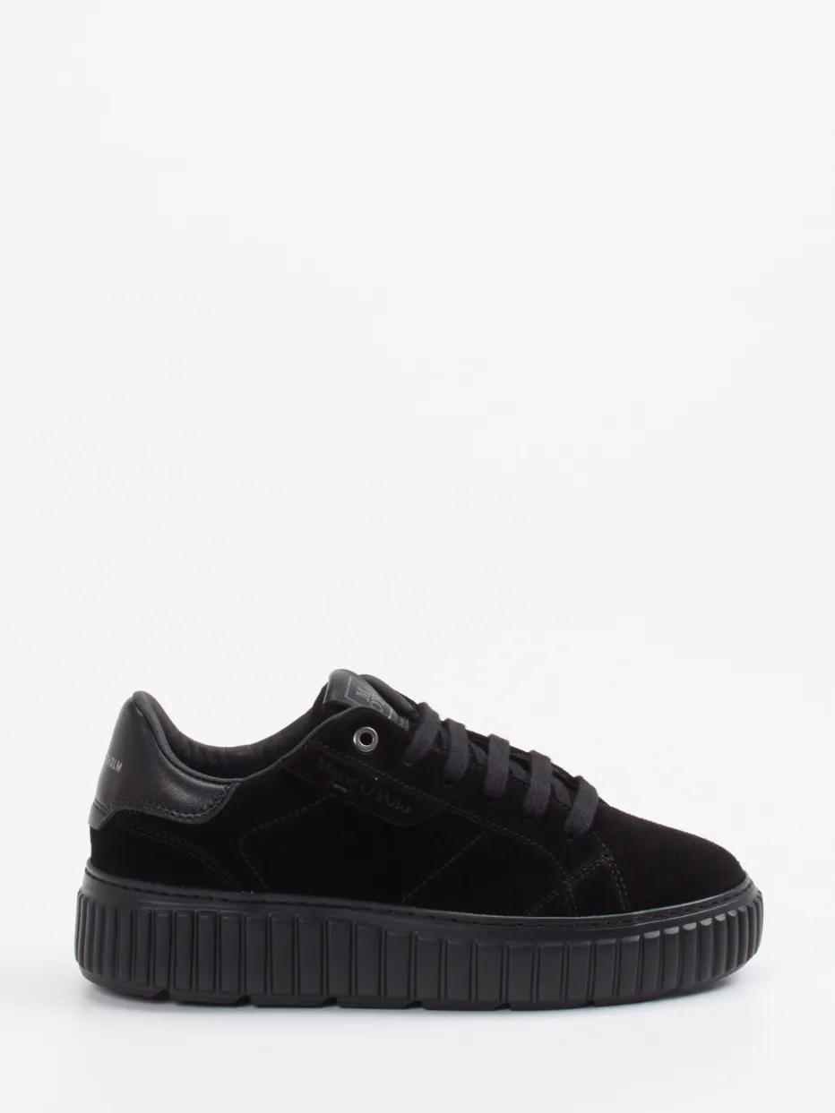 Ideal für trendbewusste City-Looks vereint das Modell hochwertigen Auftritt und Komfort. Das schwarze Veloursleder verleiht dem Low-Top-Sneaker eine samtige Haptik, während Glattleder-Details an der Ferse und Ton-in-Ton-Logos subtile Akzente setzen. Die profilierte EVA-Gummisohle wirkt nicht nur markant, sondern bietet auch Dämpfung und Leichtigkeit. Innen garantiert atmungsaktives Textilfutter mit recycelten Komponenten ein angenehmes Tragegefühl. Das chunky Design harmoniert mit Streetwear-Einflüssen und passt perfekt zu Oversized-Fashion.
