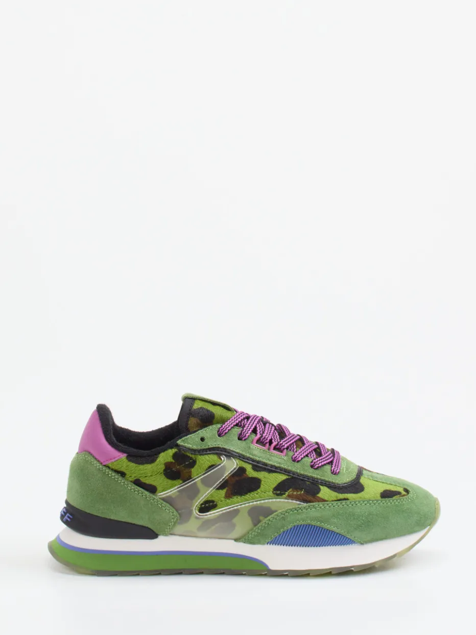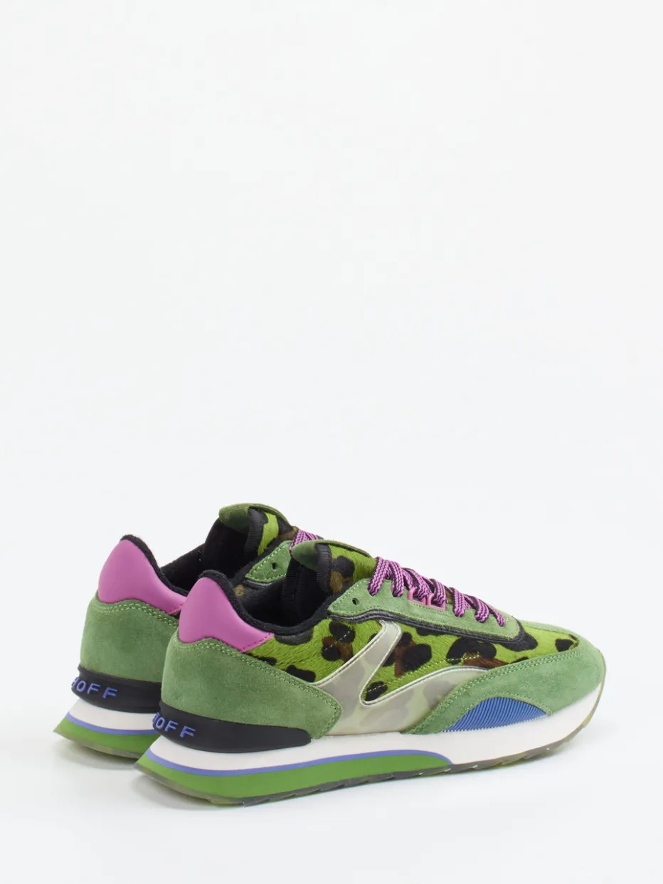 Extravagantes Design trifft Alltagstauglichkeit.THE HOFF BRAND liefert mit diesem Low-Top Sneaker ein markantes Modell für urbane Style-Statements. Ob für die City oder angesagte Events – das Modell überzeugt mit Veloursleder, samtig angeschliffen, kombiniert mit Textil in tierisch-gefärbter Felloptik. Die grasgrüne Grundfarbe wird von violett-schwarzen Schnürsenkeln und transparenten Seitenelementen akzentuiert. Ein gepolsterter Schaft und das frotteeweiche Innenfutter sorgen für Tragekomfort, während die mehrfarbige Gummisohle sicheren Halt bietet. Die Silhouette erinnert an Retro-Running-Stile und greift aktuelle Color-Blocking- sowie Animal-Print-Trends auf. Ein Unisex-Sneaker mit Eyecatcher-Faktor und klarer Streetstyle-Attitüde.