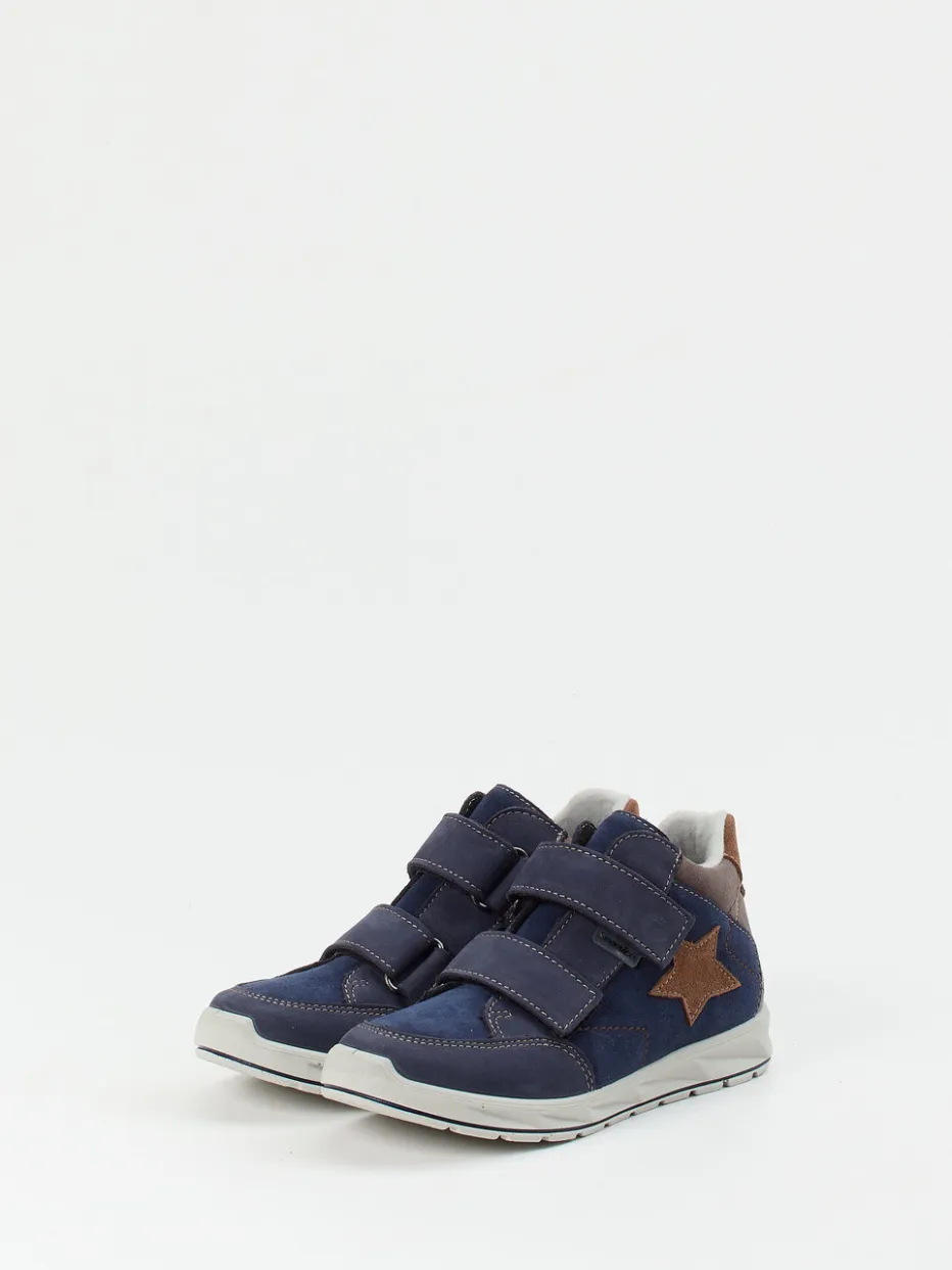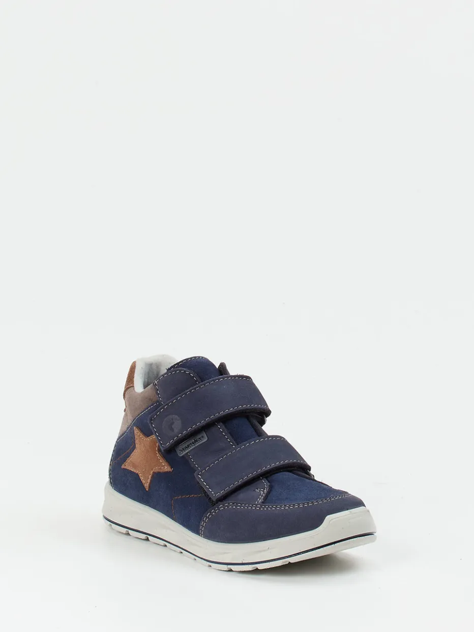 Bewegungsfreude trifft Alltagstauglichkeit.Der Mid-Cut-Sneaker von Ricosta überzeugt als praktischer Kinderschuh für Herbst und Winter. Für bewegungsintensive Tage bietet das dunkelblaue Veloursleder mit samtig-matter Oberfläche sowie cognacbraunen und grauen Details zuverlässigen Komfort. Die knöchelhohe Form mit gepolstertem Schaftrand schützt den Fuß, während Klettverschlüsse das Anziehen erleichtern. Eine hell profilierte PU-Sohle sorgt für sicheren Halt, auch bei unbeständigem Wetter. Stern-Applikation und Kontrastnähte ergänzen das Design genretypisch im Streetwear-Stil. Harmoniert ideal mit leichter Thermo-Leggings oder Steppjacke. Ricosta kombiniert kindgerechte Passform mit pflegeleichten, langlebigen Materialien.